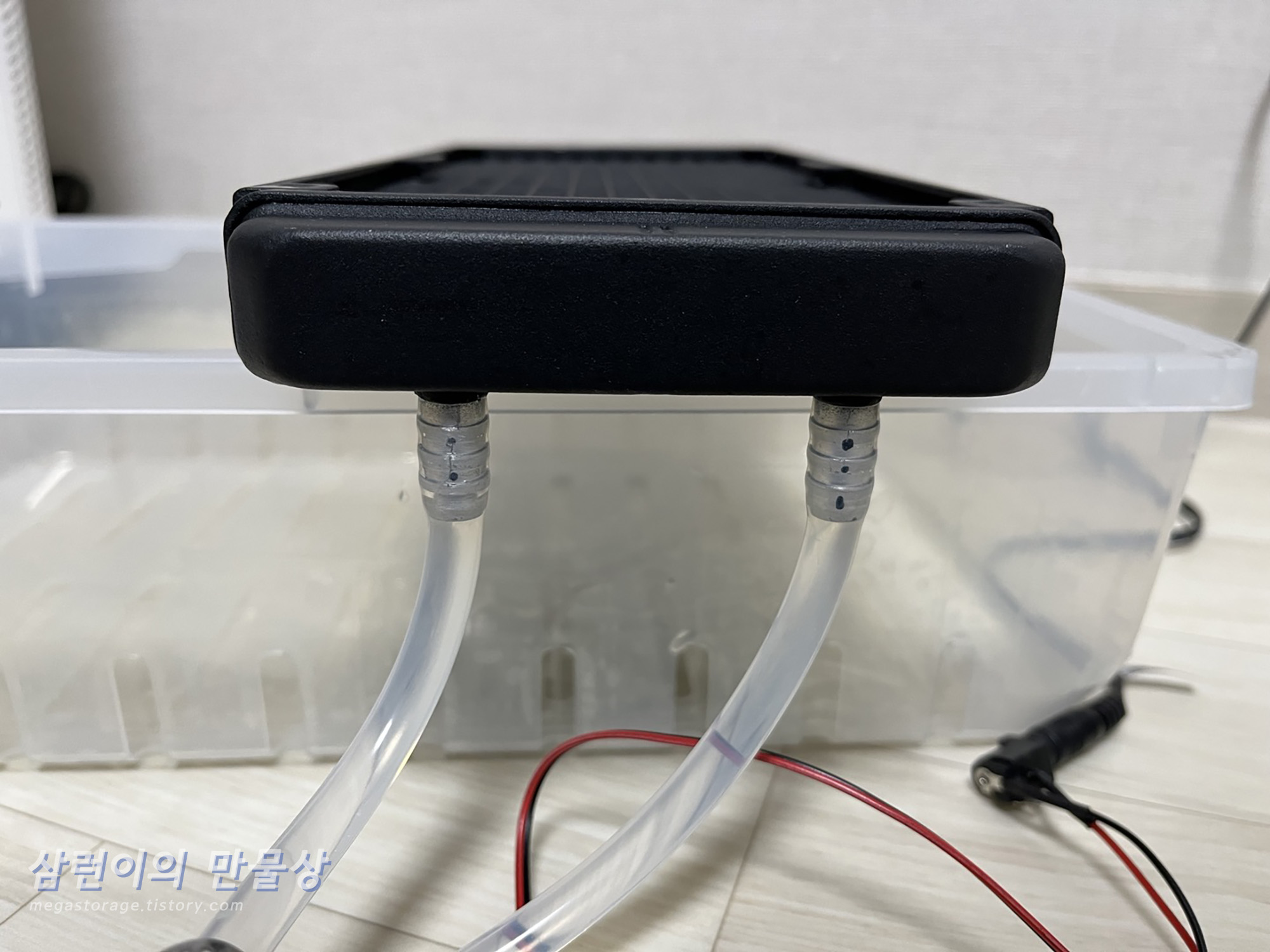 12V 전압을 넣어준 상태인데 공기방울 하나 없이 펌프가 매우 조용하게 돕니다. 진짜 조용합니다. 우우웅... 하는 소리가 조용하게 납니다. (위 사진의 빨강/검정 핀 색상이 다른 이유는, 전원 공급하는 파워 서플라이의 케이블을 반대로 연결했기 때문임)