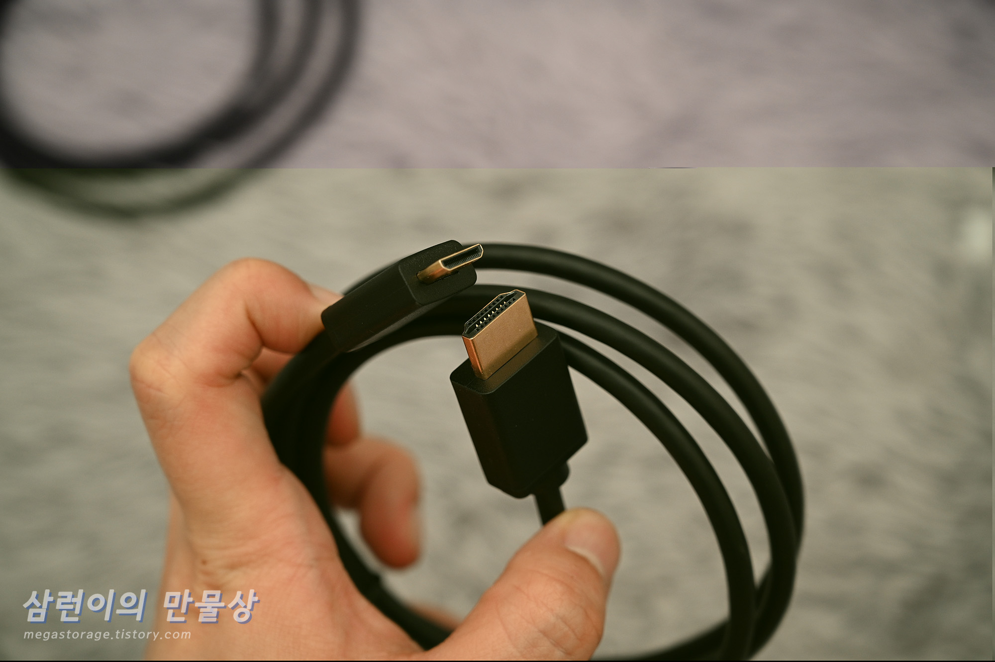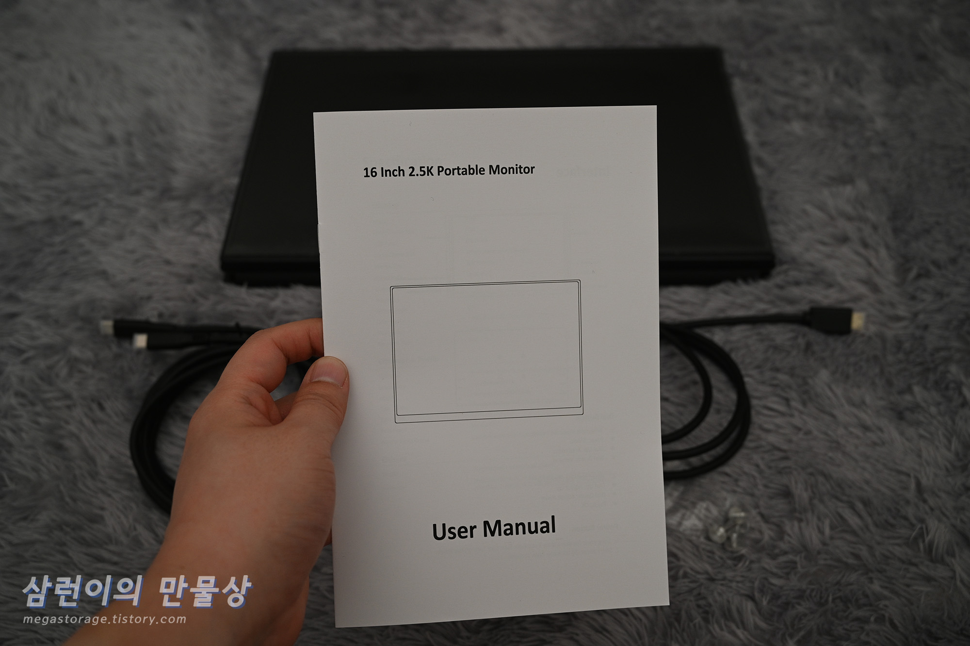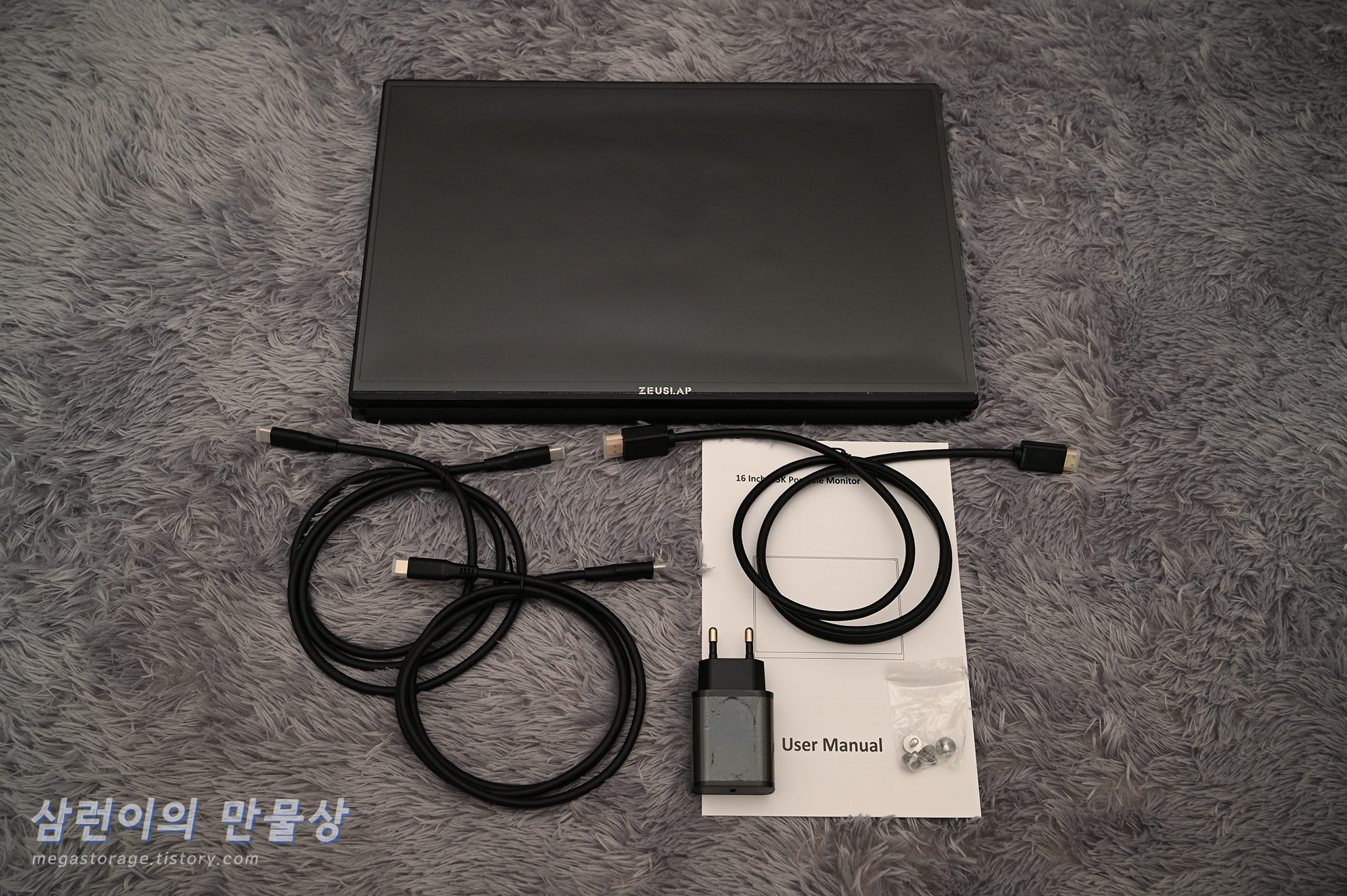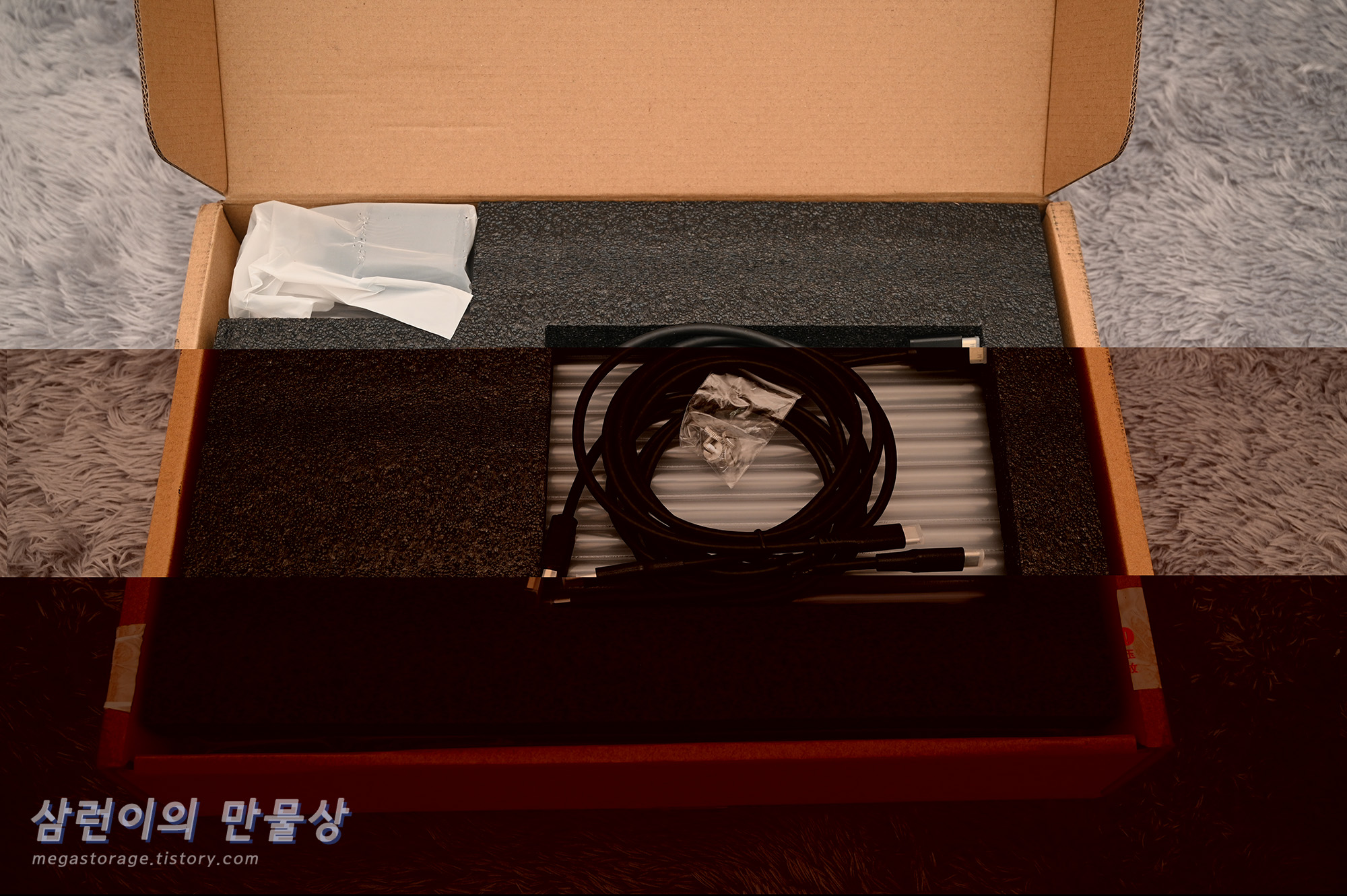 USB-C 케이블 2개입니다. 상당하 두껍습니다. 하나는 전원 연결용, 다른 하나는 노트북 또는 PC 연결용입니다. 두 케이블은 별도로 구분되어있지 않습니다.