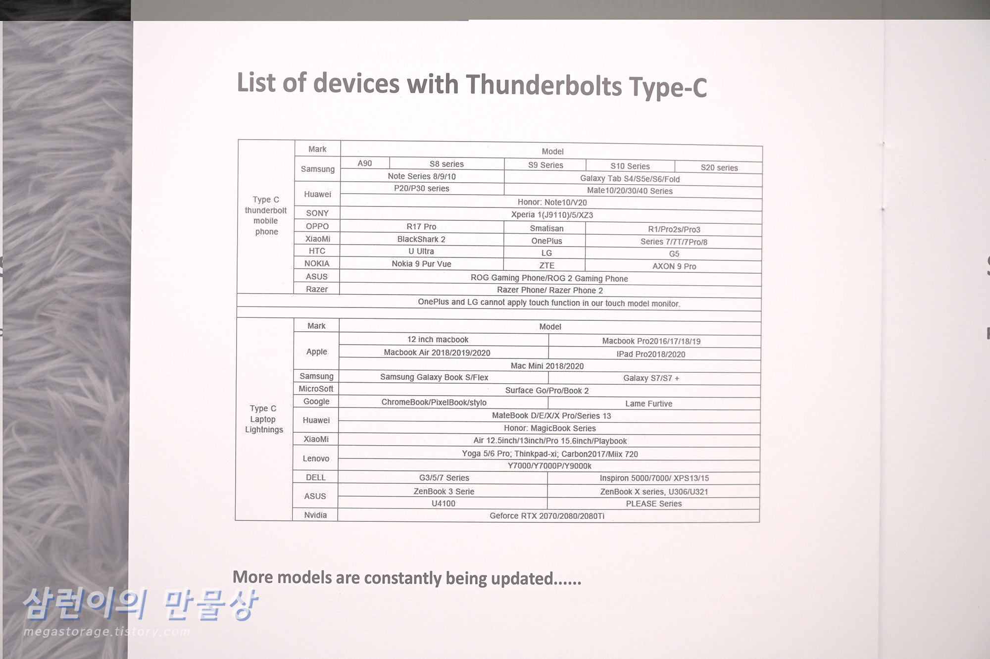 호환성 리스트입니다. 요즘 나온 USB-C 타입의 스마트폰은 거의 다 연결되며, USB-C 포트(DP-Alt)가 있는 노트북과 대부분 연결됩니다.