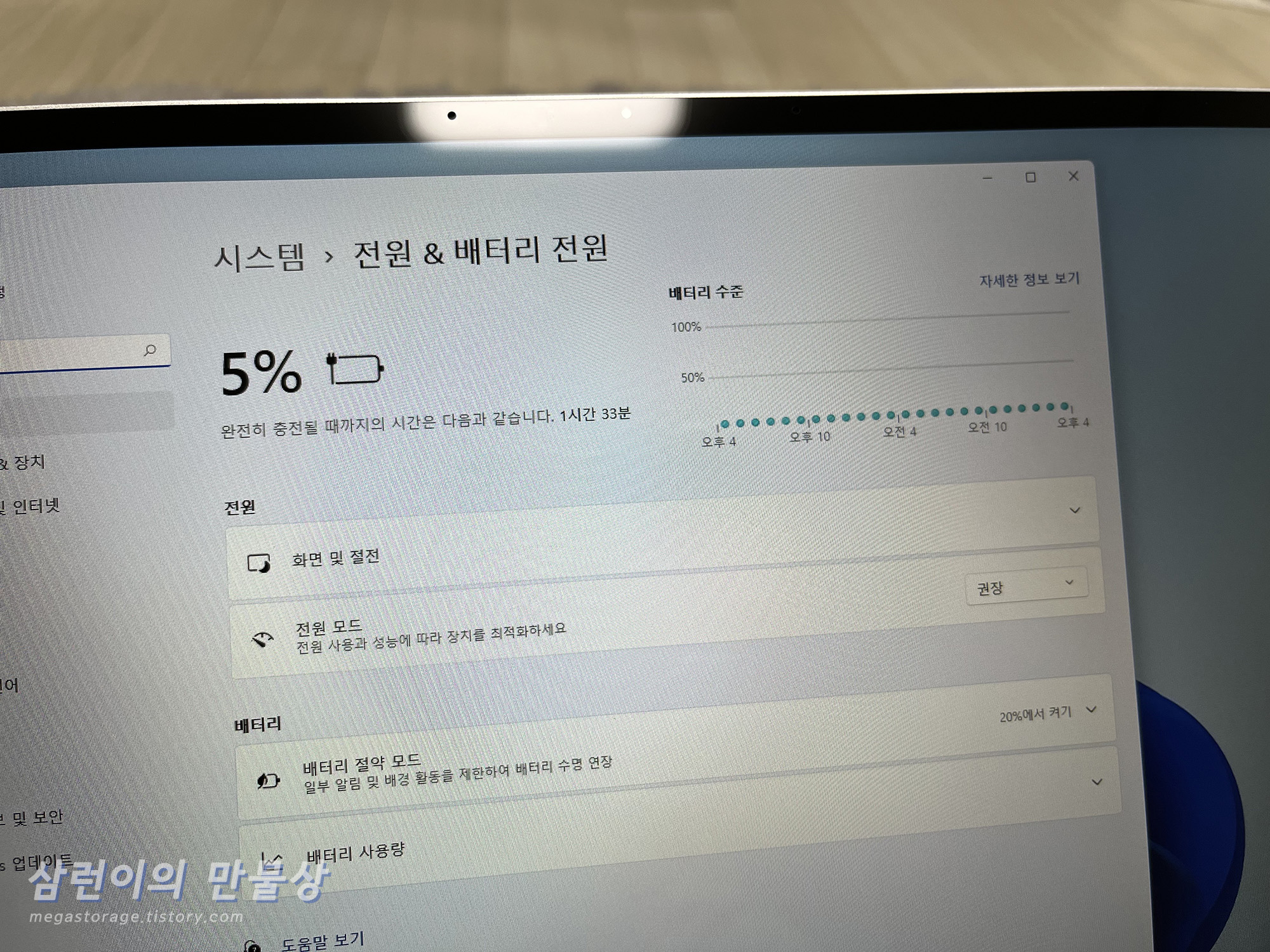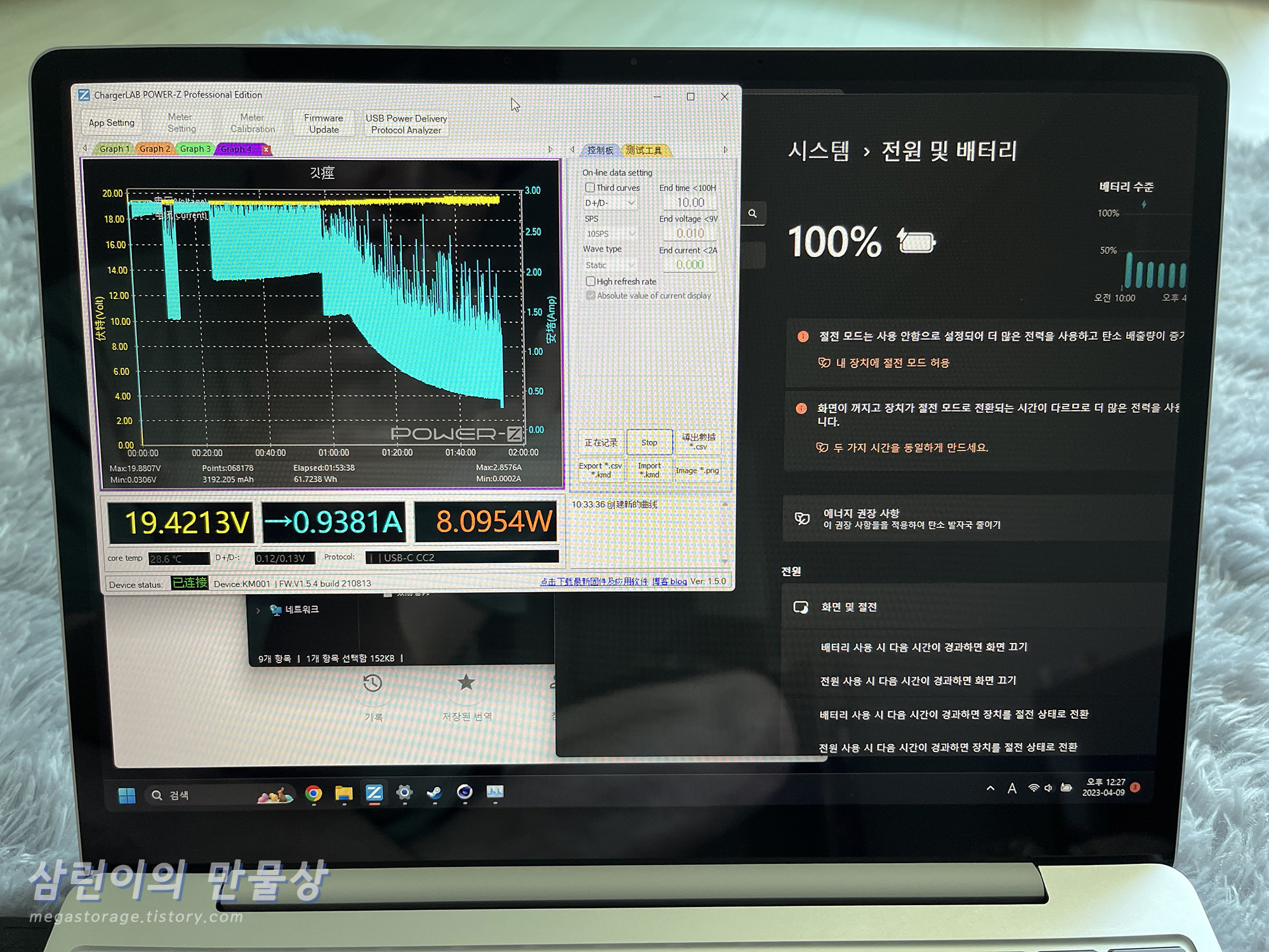 충전을 시작한지 1시간 50분이 넘었을 때, 배터리가 완전 충전되었습니다. 9%부터 100%까지 1시간 50분이 걸린 것입니다. 너무 오래 걸리네요.. 이건 노트북을 켜 둔 상태라서, 노트북을 끈 상태에서 충전을 하면 시간이 훨씬 단축될 수도 있습니다.