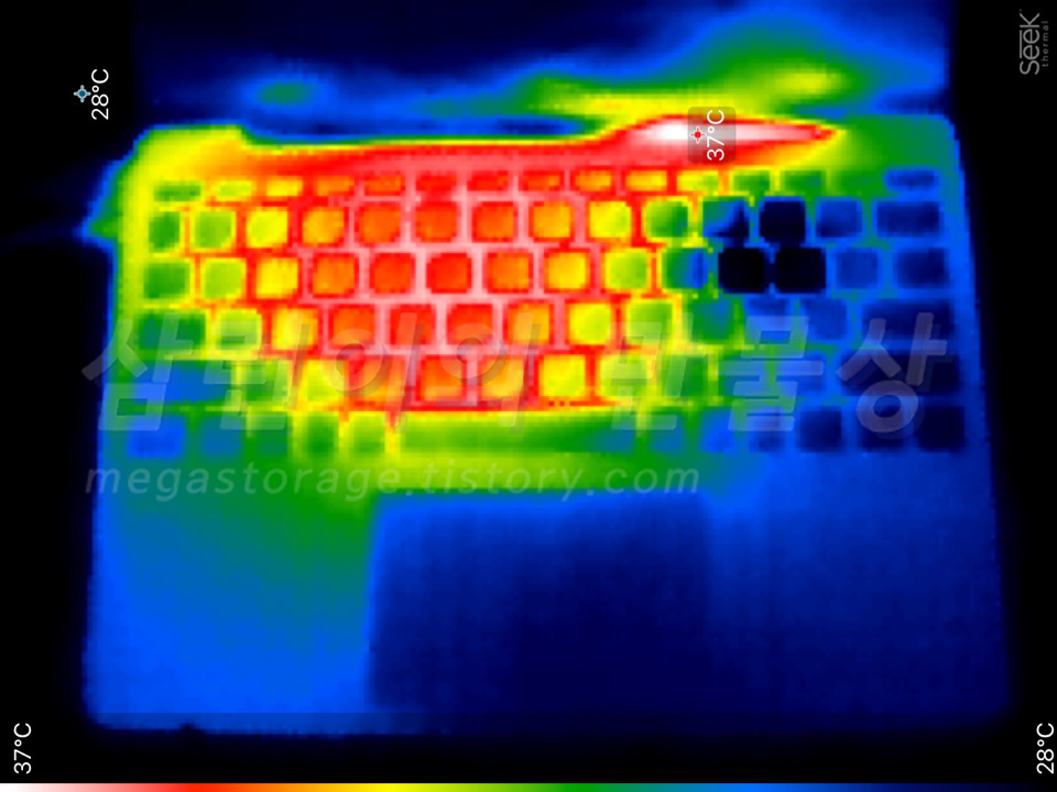 쿨러는 단 하나입니다. 어딘가로 들어온 공기들을 오른쪽 방향으로 빼냅니다. 이 공기들이 들어올 곳은 모니터와 키보드 사이의 힌지쪽 구멍 뿐입니다. 발열 관리가 매우 취약한 구조입니다.