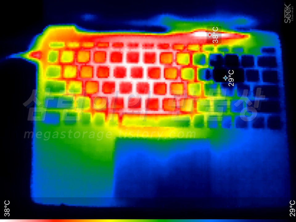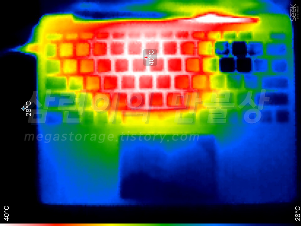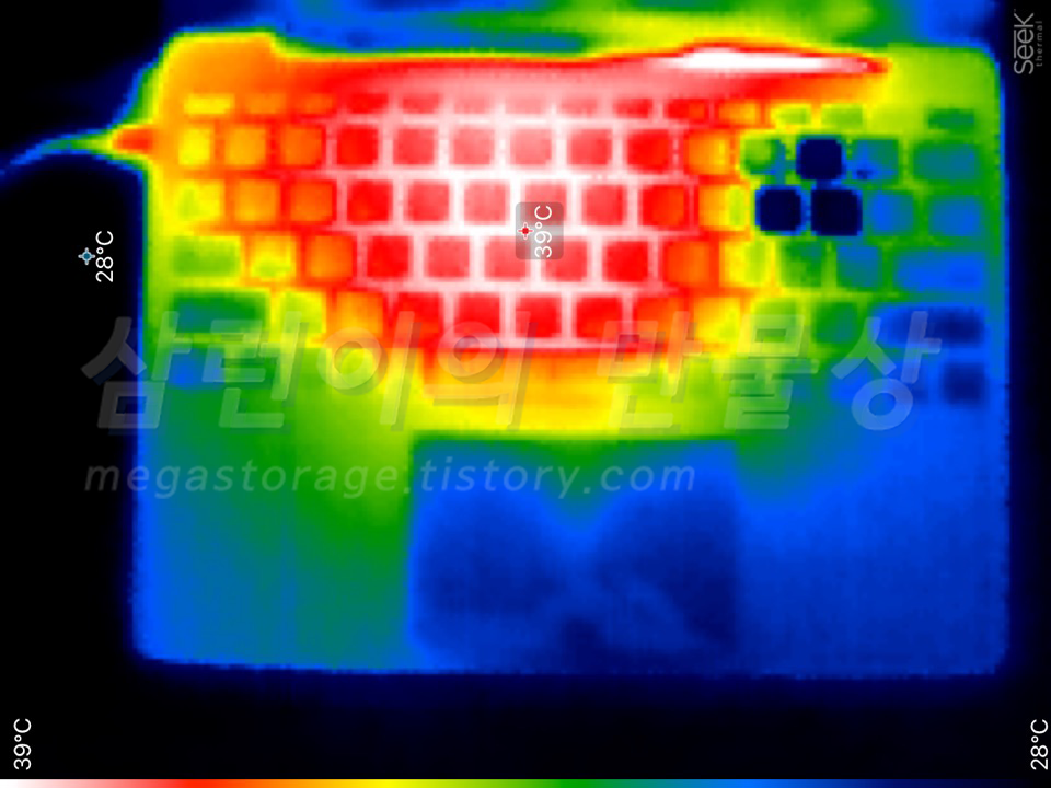 충전 시작 약 5분 경과 후, 키보드 아래의 메인보드 온도가 약 39도가 되었습니다.