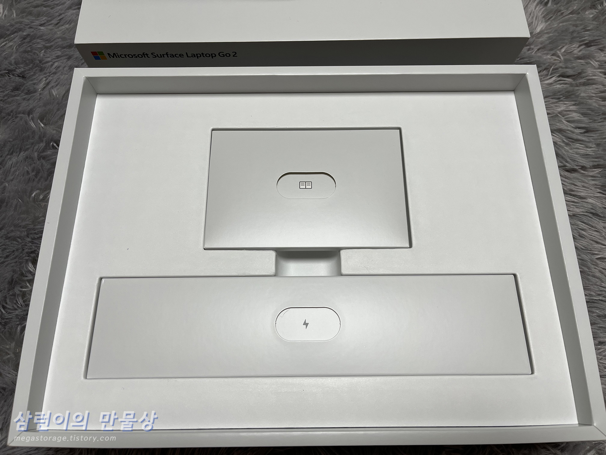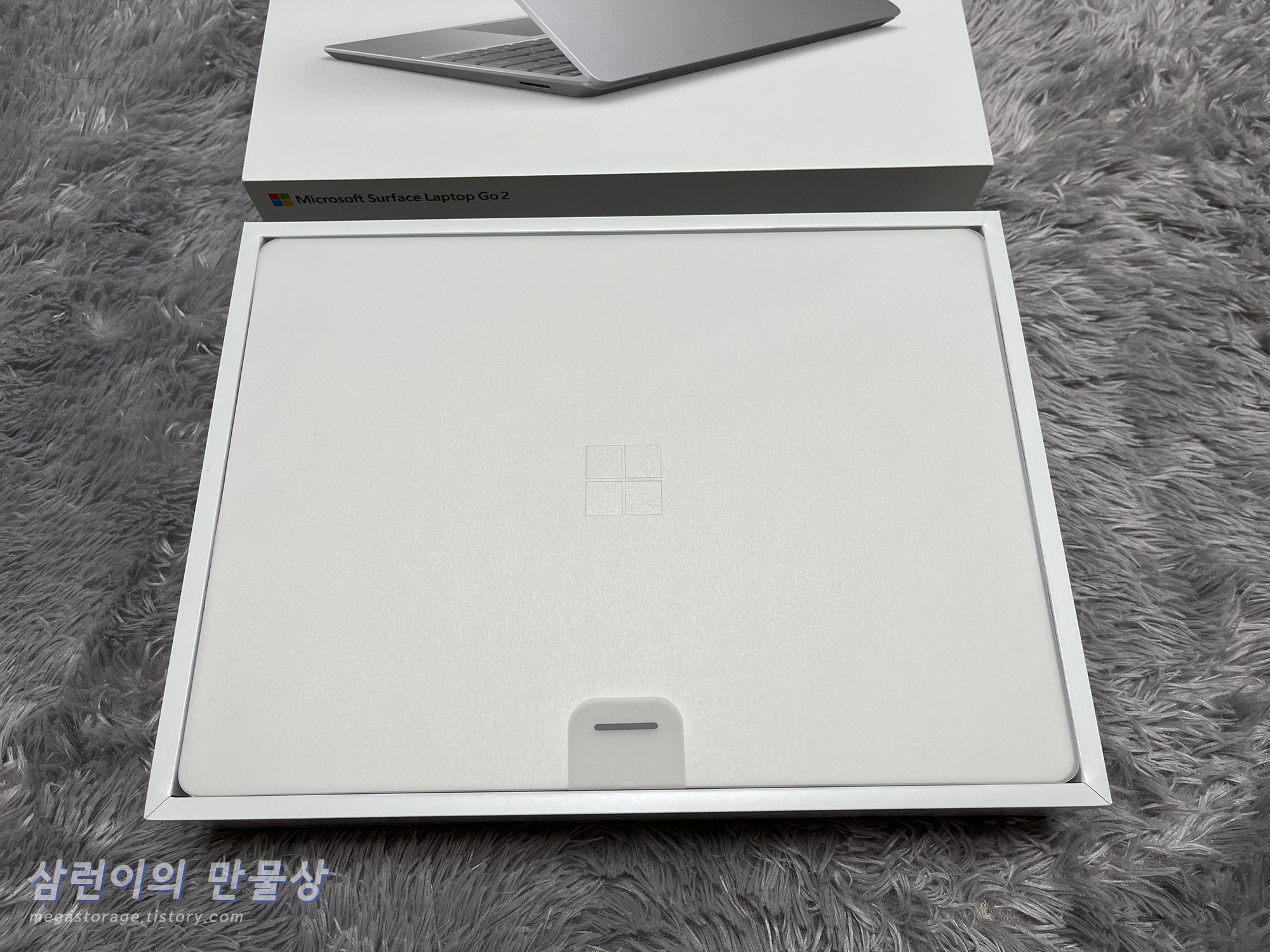 박스를 열면 서피스 랩탑 고 2가 보입니다. 손잡이를 잡고 들어올리면 됩니다.
