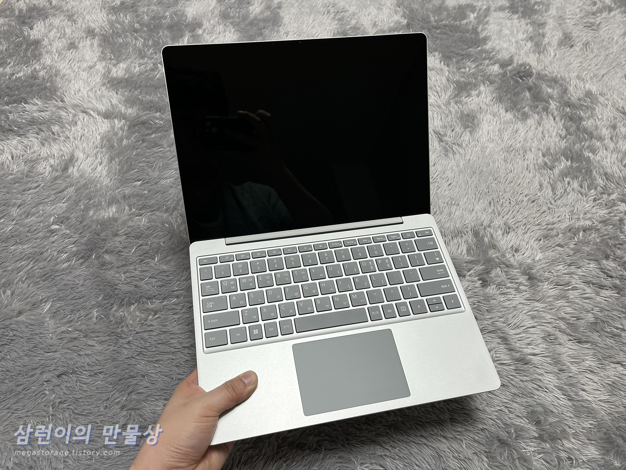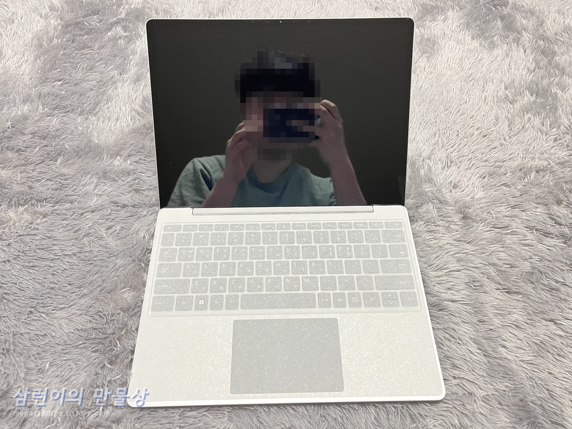 서피스 랩탑 고 2를 열어봅니다. 디스플레이는 글레어 타입으로 거울 같습니다. 제 얼굴이 완전 또렷하게 찍혀버렸네요.