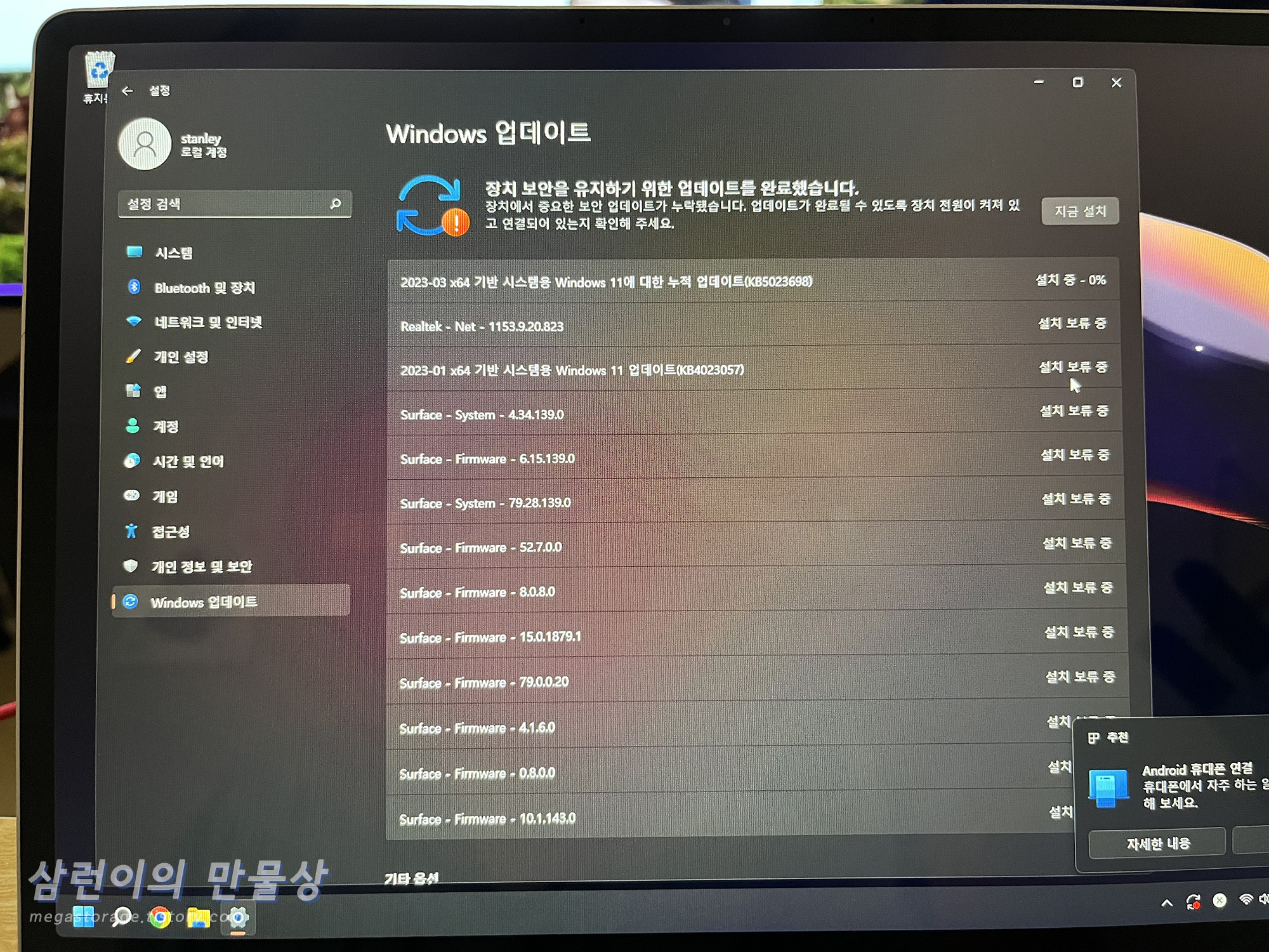 윈도우 업데이트를 진행합니다. 거의 1년 동안 출시된 펌웨어들이 한꺼번에 업데이트 되었습니다.