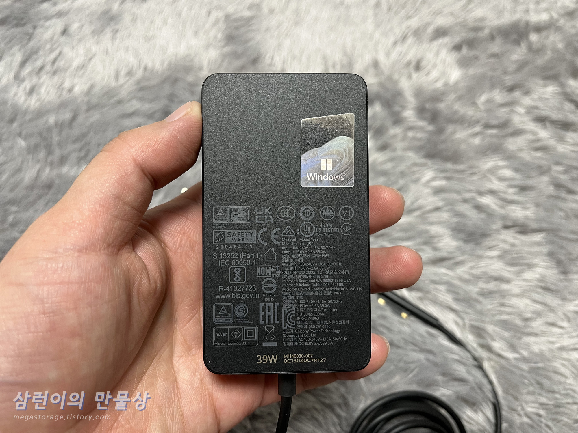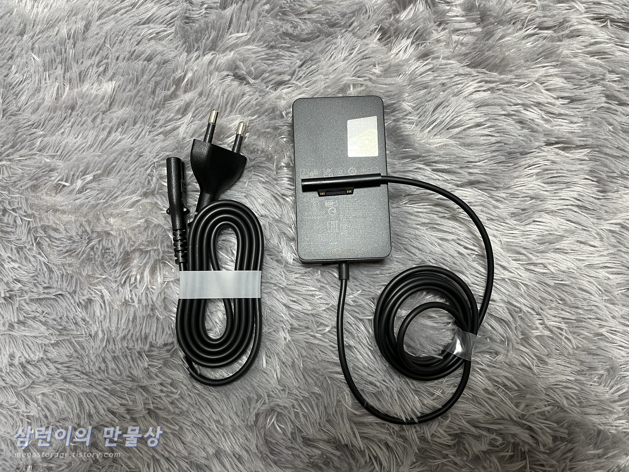 충전기 입니다. 전원 케이블과 충전기 본체로 구성되어 있습니다. 서피스 전용 충전기 포트와 연결되도록 구성되어 있습니다.