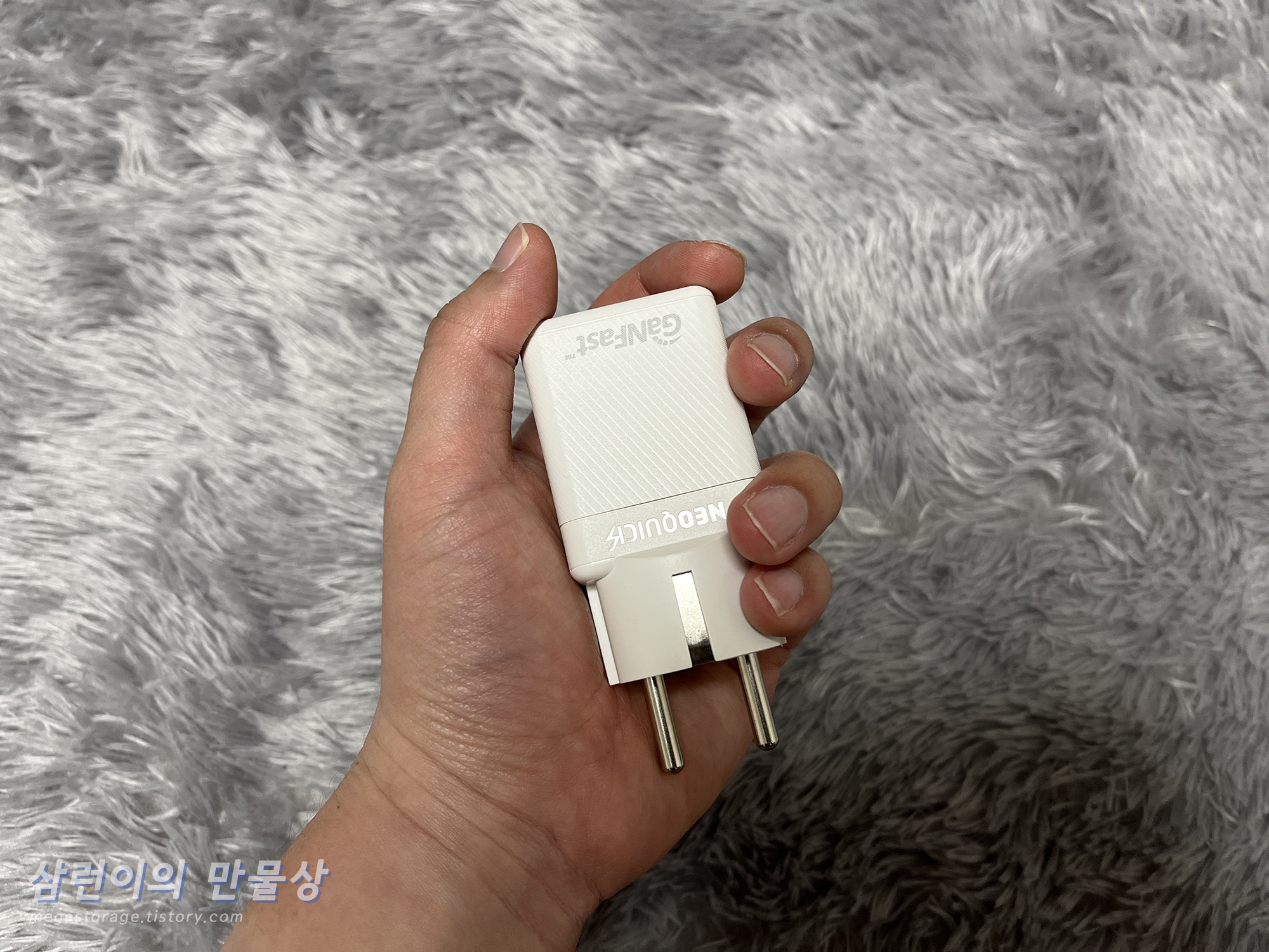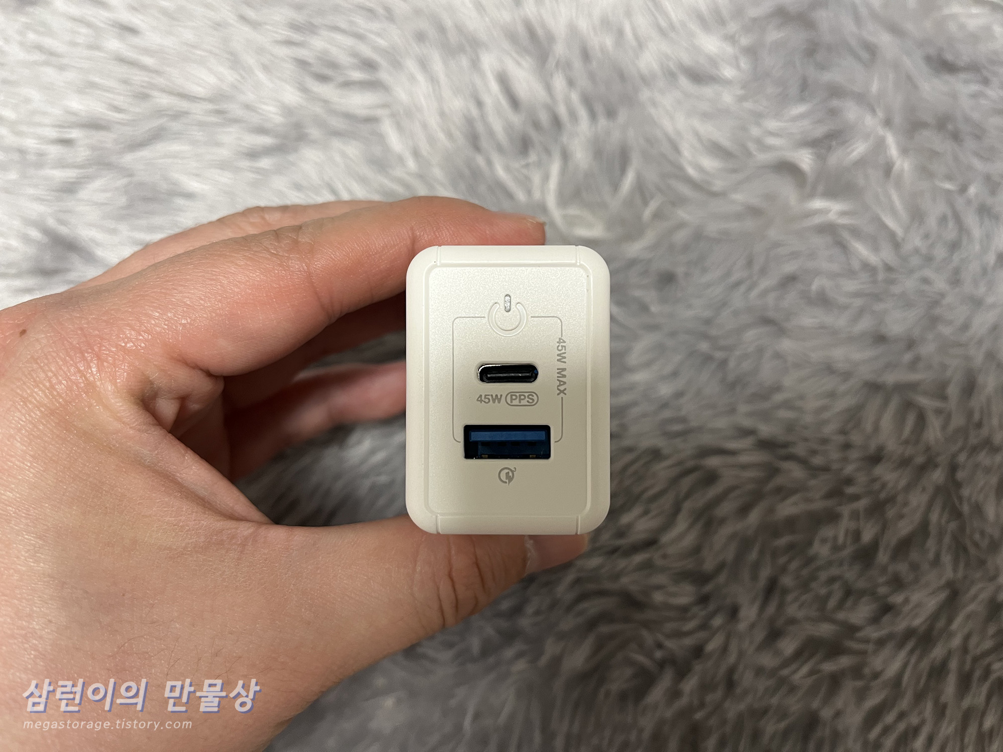 손으로 쥐면, 위와 같은 느낌입니다. 정말 작습니다. 이 작은 충전기에서 단일 45W 출력이 나온다니.. 신기합니다.