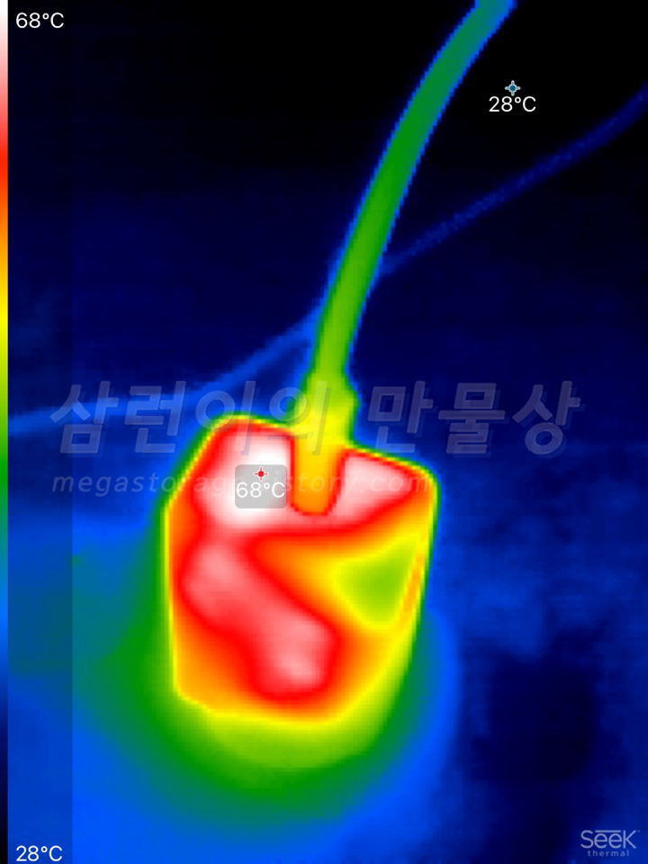 45W 출력을 약 20분 간 유지하니까 충전기의 USB-A 포트 부분의 온도가 68도로 측정되었습니다. (측정 장비 : Seek Thermal Compact) 당연하지만, 위 상황에서 USB-A 포트 부분에 손을 가져다 대니까 상당히 뜨겁더라구요. 샤워할 때 물 조절 잘못해서 뜨거운 물을 맞았을 때보다 더 뜨거운 느낌..