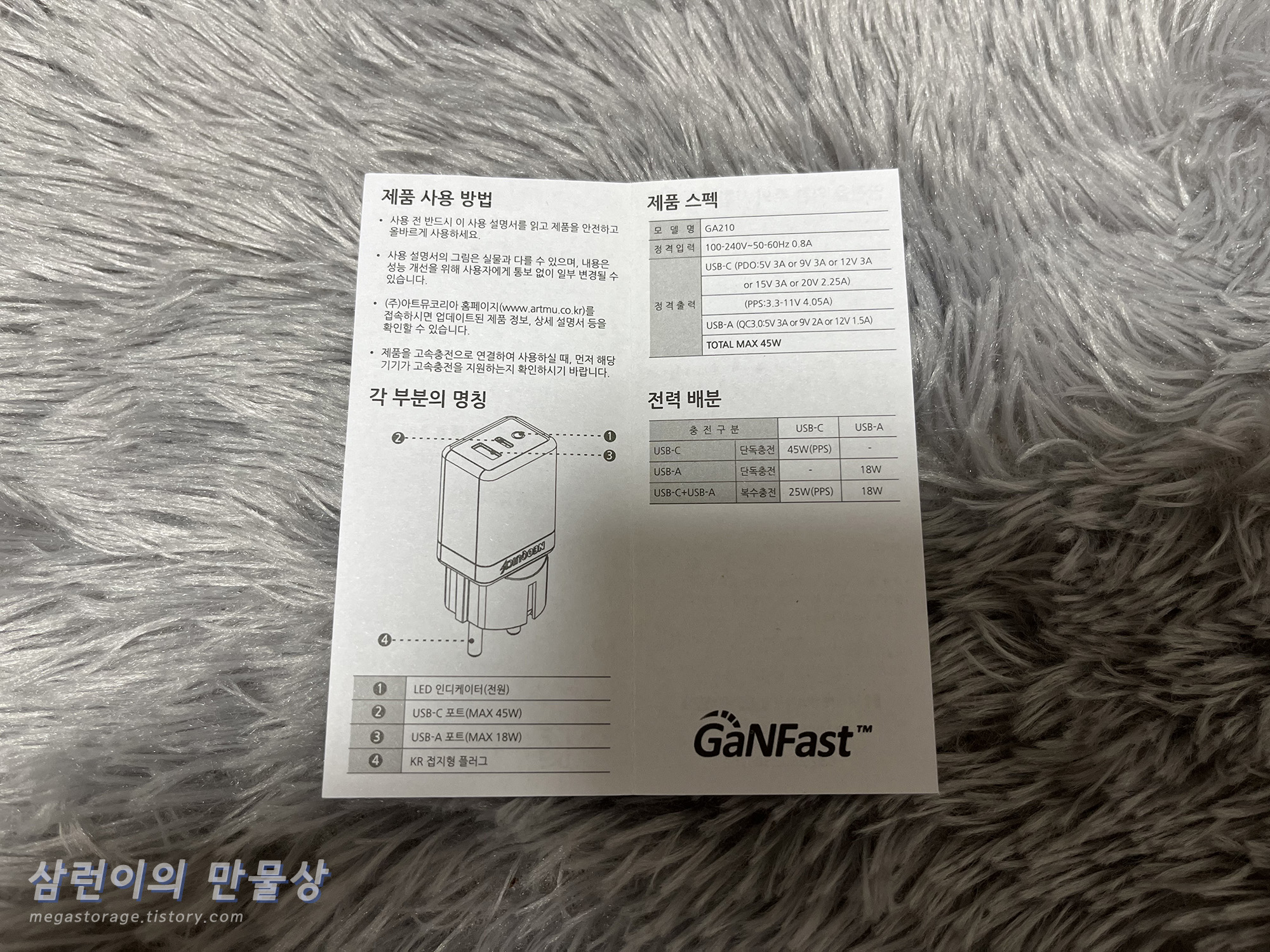 그래서 접지가 되는 USB-PD 충전기를 구입하고 싶었습니다. 그리고 접지가 되는 충전기 중에서 작고 출력이 좋은 모델을 찾아봤습니다. 여기서 가성비가 좋으면? 정말 최고입니다. 그렇게 찾아봤습니다. 아트뮤(Artmu)라는 회사가 나옵니다. 디자인도 좋고 크기도 작으면서 접지를 지원합니다. 그리고 가격도 저렴합니다. 저는 아트뮤의 충전기 모델 중에서 단일 45W 출력을 지원하면서 USB-C 포트 1개, USB-A 포트 1개가 달려있는 GA210 모델을 구입했습니다.