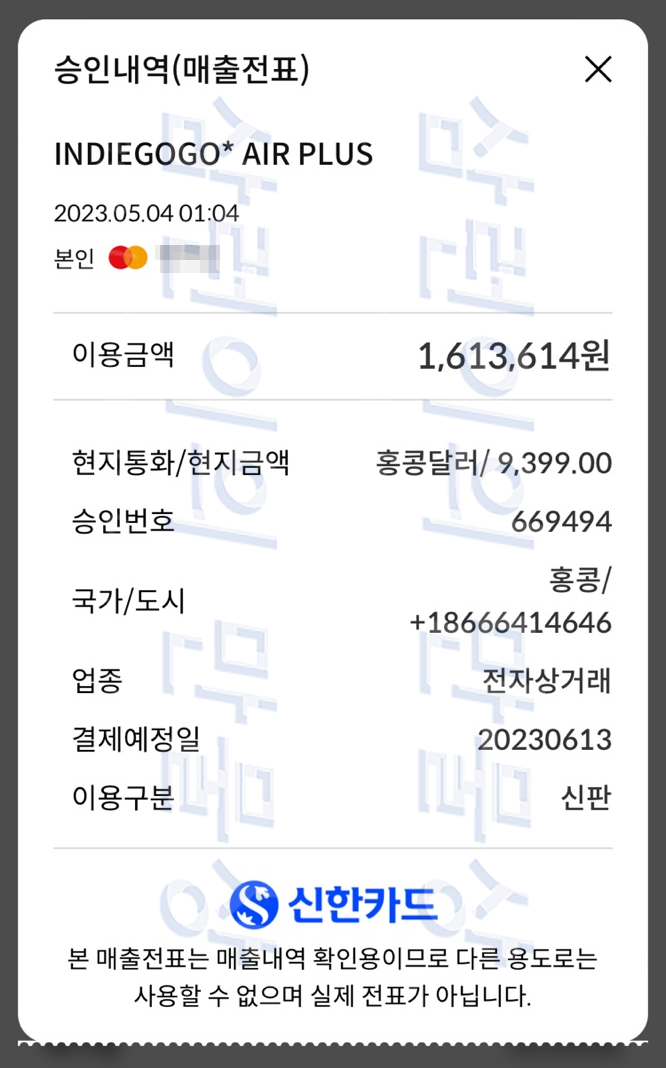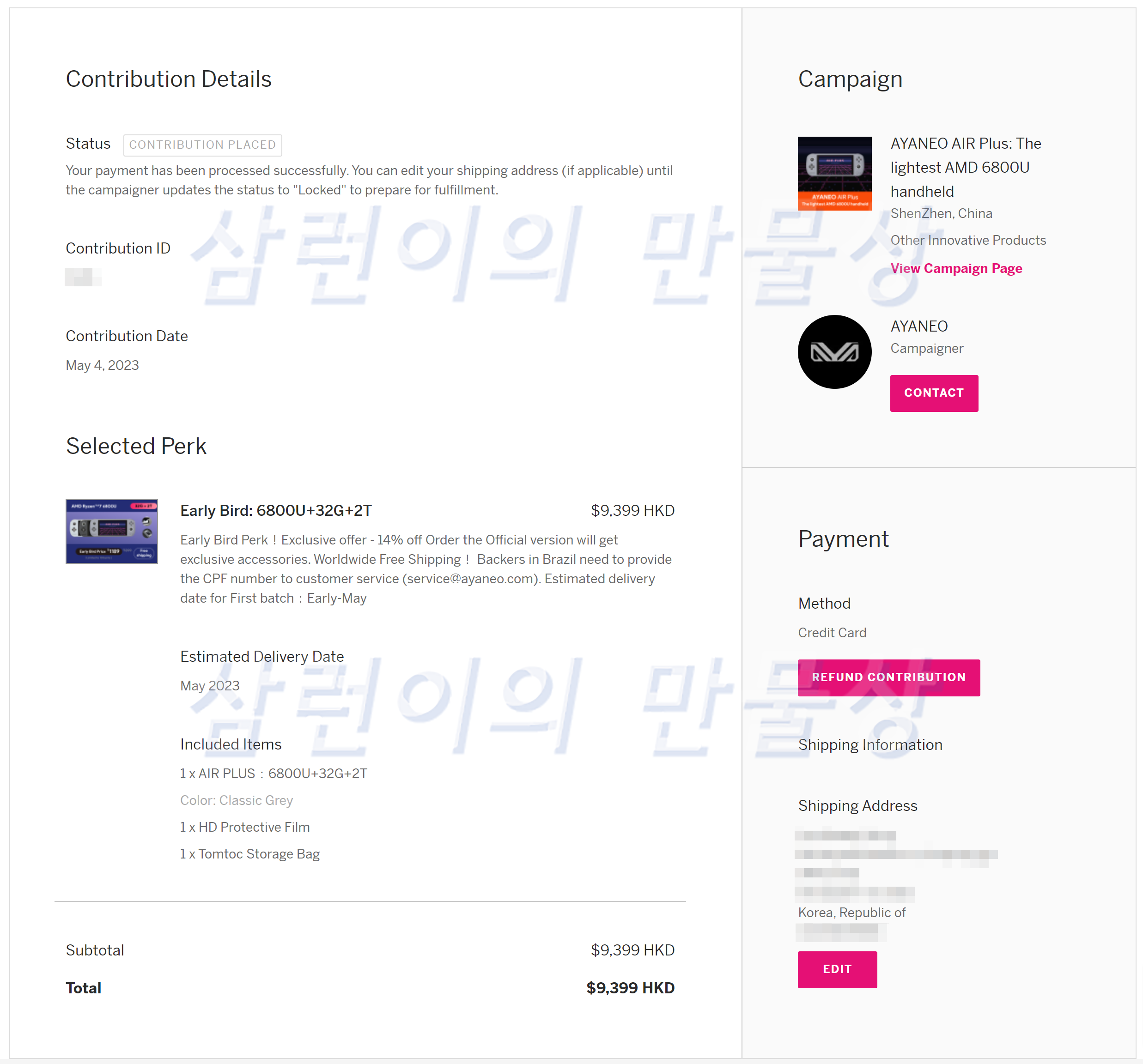 인디고고에서 펀딩 참여는 처음 해봤습니다. 펀딩 참여한 것을 Contribution 이라고 하나봅니다. 9,399 HKD(홍콩 달러) 결제했으며, 실제 승인된 금액은 161만 3,614원입니다. 느낌상.. '홍콩 달러 → 미국 달러 → 대한민국 원화'로 환전되면서 금액이 증가한 것으로 보여집니다. 슬프네요..