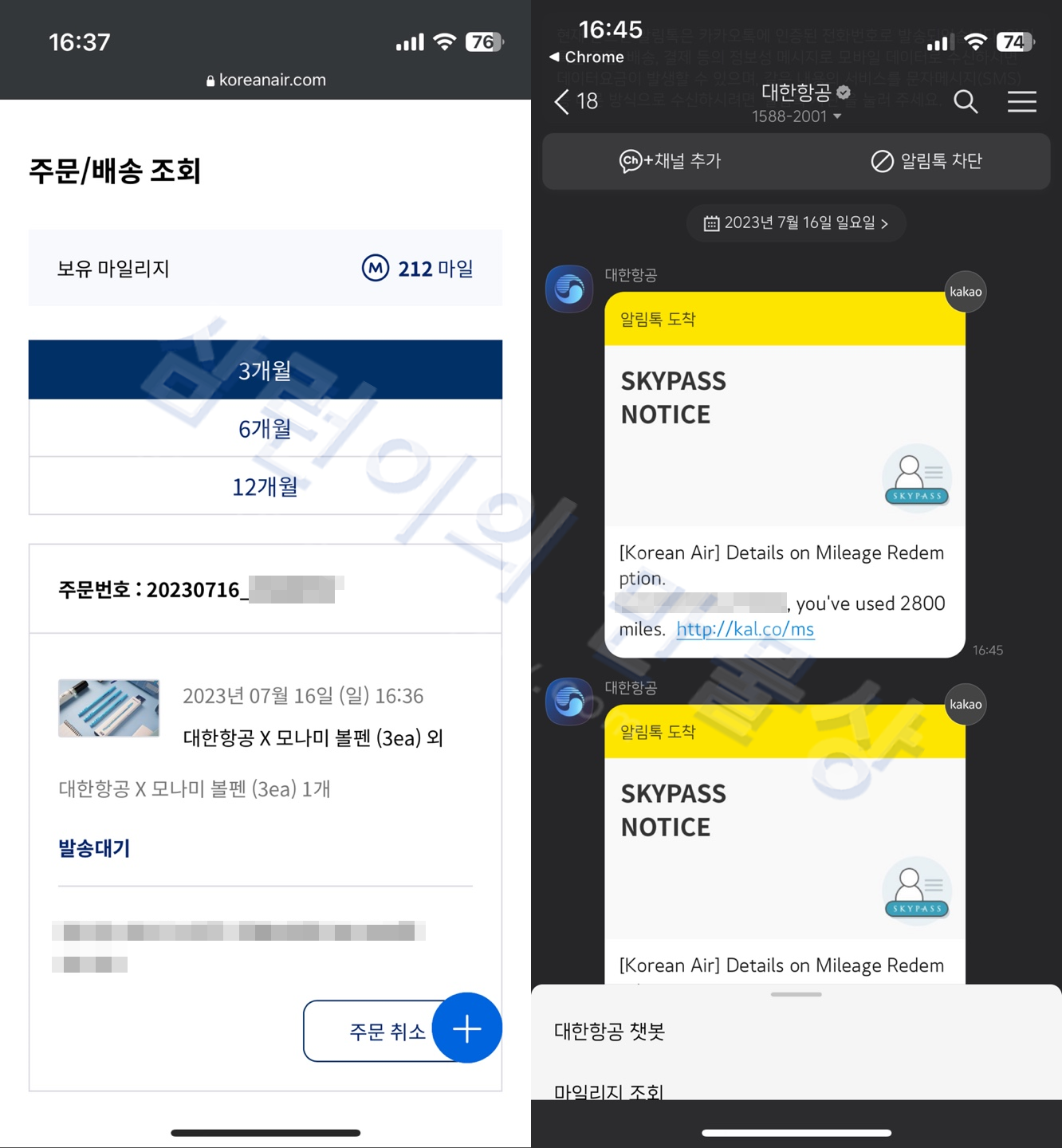 주문 내역에 들어가면 정상적으로 주문되었는지 확인할 수 있습니다. 카카오톡으로 마일리지 사용 내역도 같이 날아옵니다.