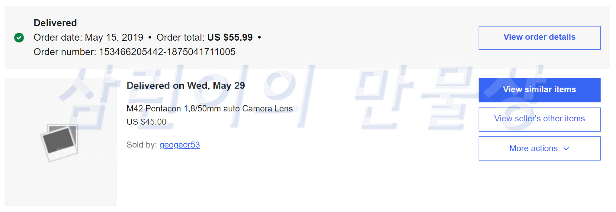 이베이에서 구매 내역을 찾아봤습니다. 렌즈는 2019년 5월 15일에 45불 + 배송비 10.99불해서 총 55.99불에 구매했습니다.