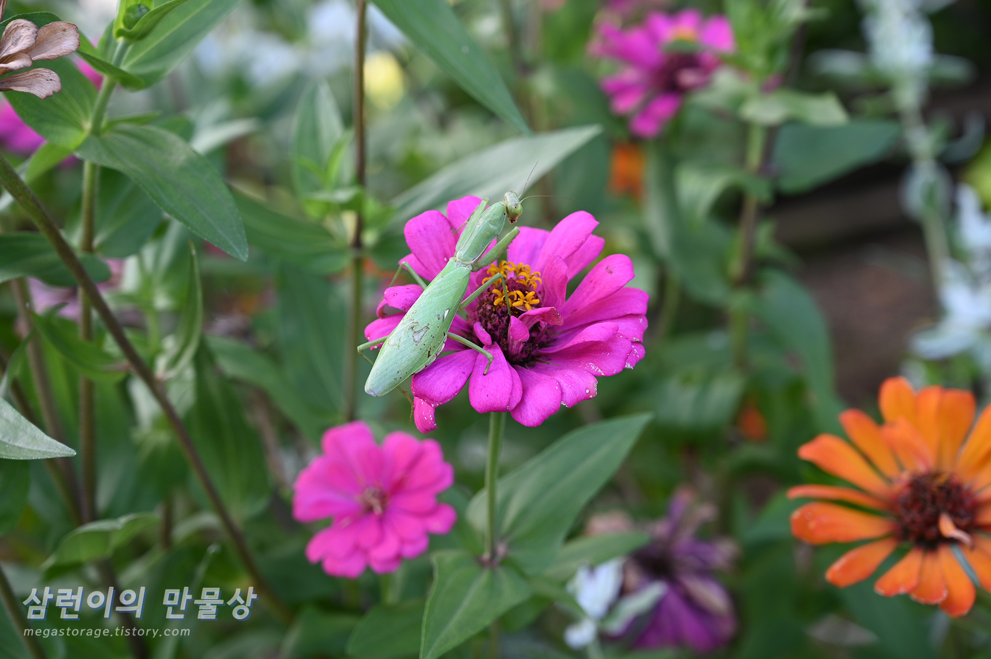 이 글의 초반에서 보신 백일홍 사진을 찍던 도중, 꽃에 뭔가 있길래 보고 깜짝 놀랜 뒤 찍은 사마귀 사진입니다. 사진 찍고 있는 저를 빤히 쳐다보고 있는 것이 귀엽(?)네요.