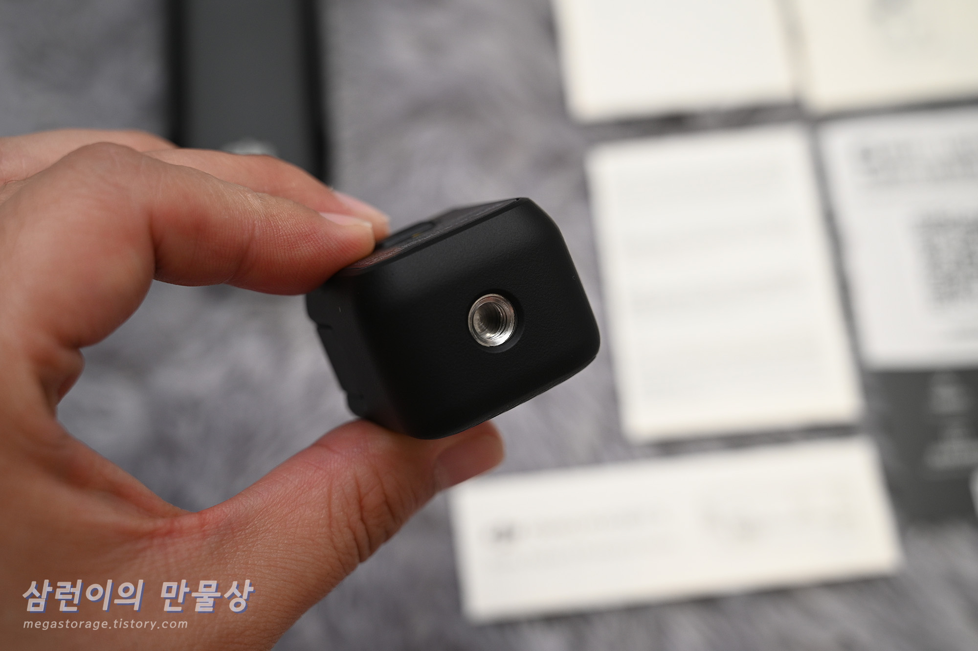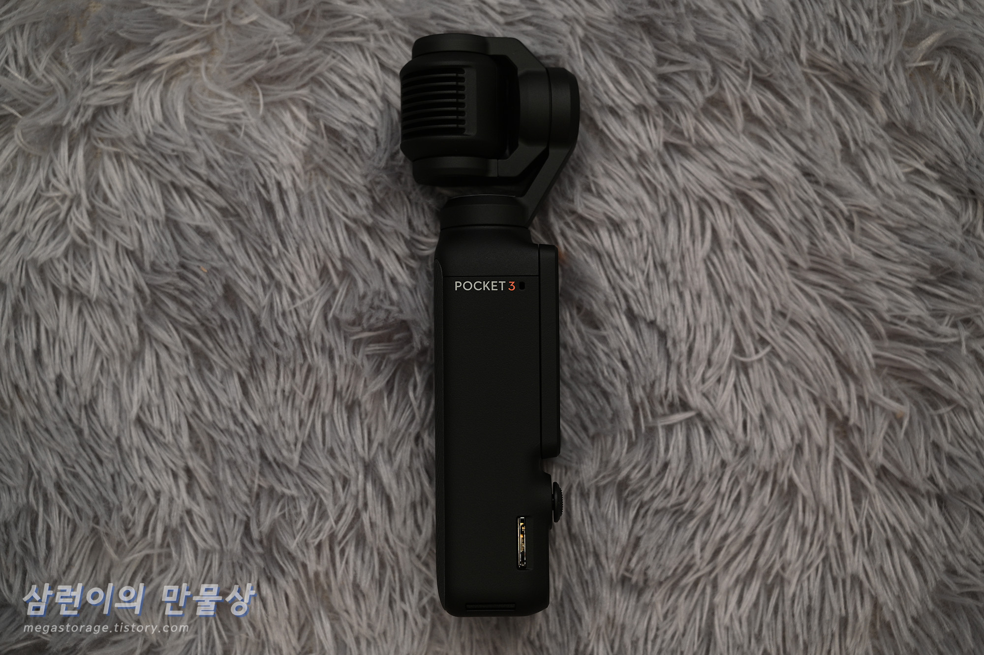 핸들의 하단에는 1/4 나사선이 있습니다. 삼각대에 연결할 때 쓰입니다. (DJI 오즈모 포켓3의 하단엔 USB-C 포트만 있고 1/4 나사선 없음)