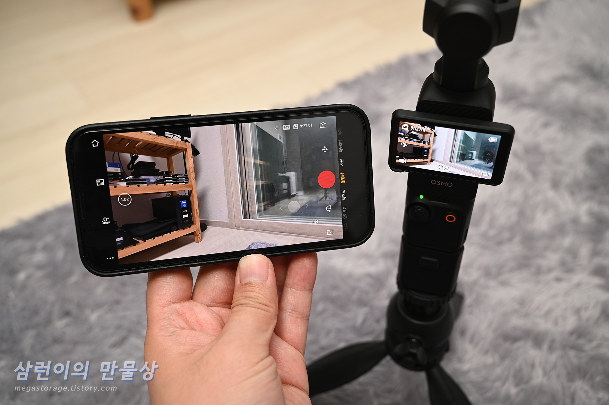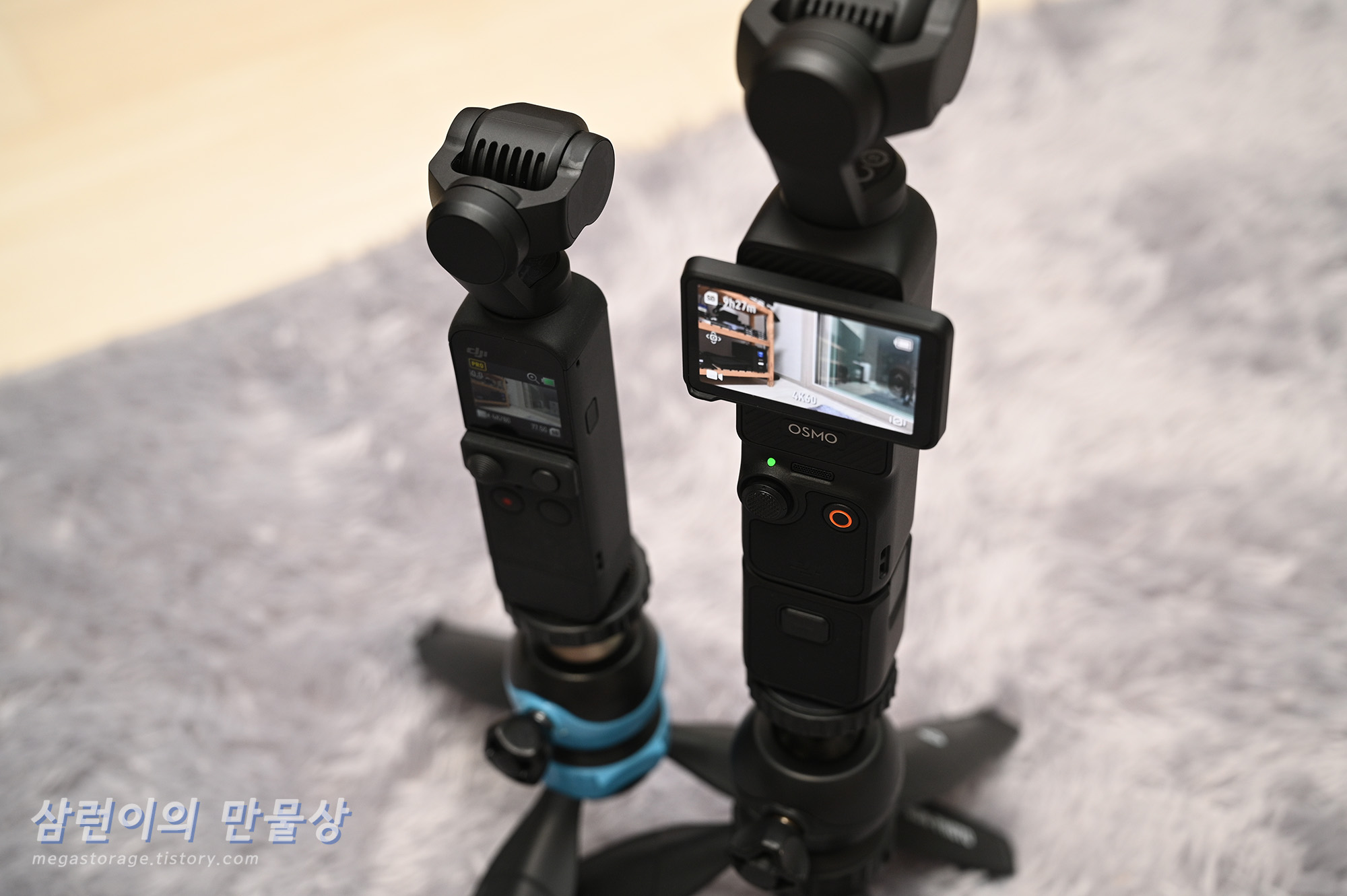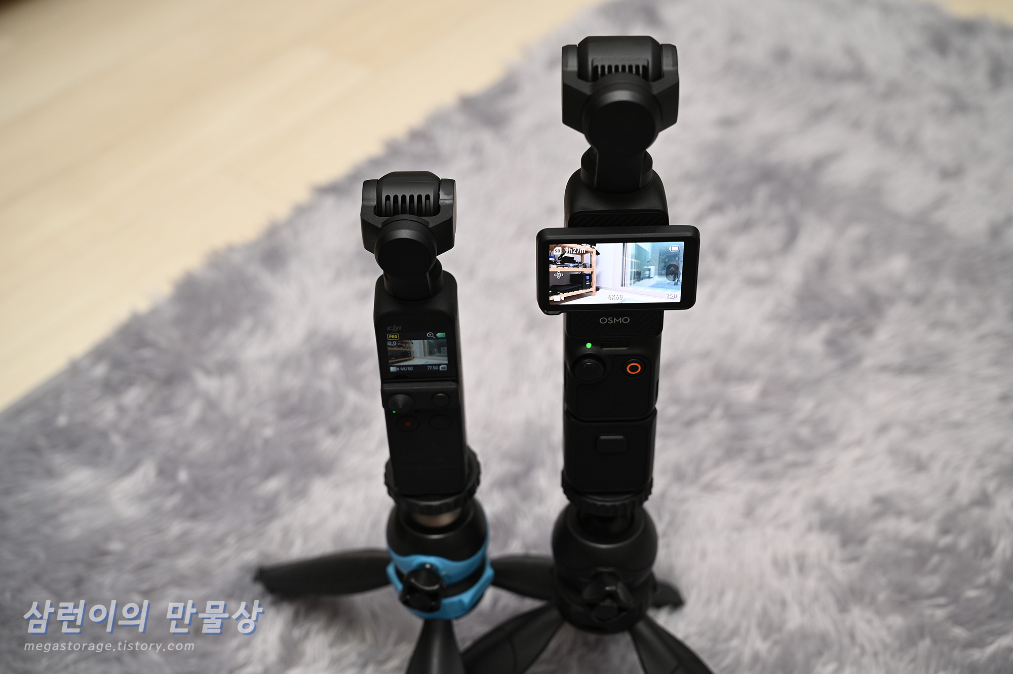 DJI 오즈모 포켓3는 아래쪽에 핸들을 달아놔서 높게 찍혔습니다. 그래도 체급 차이가 꽤 나는 것처럼 보입니다.