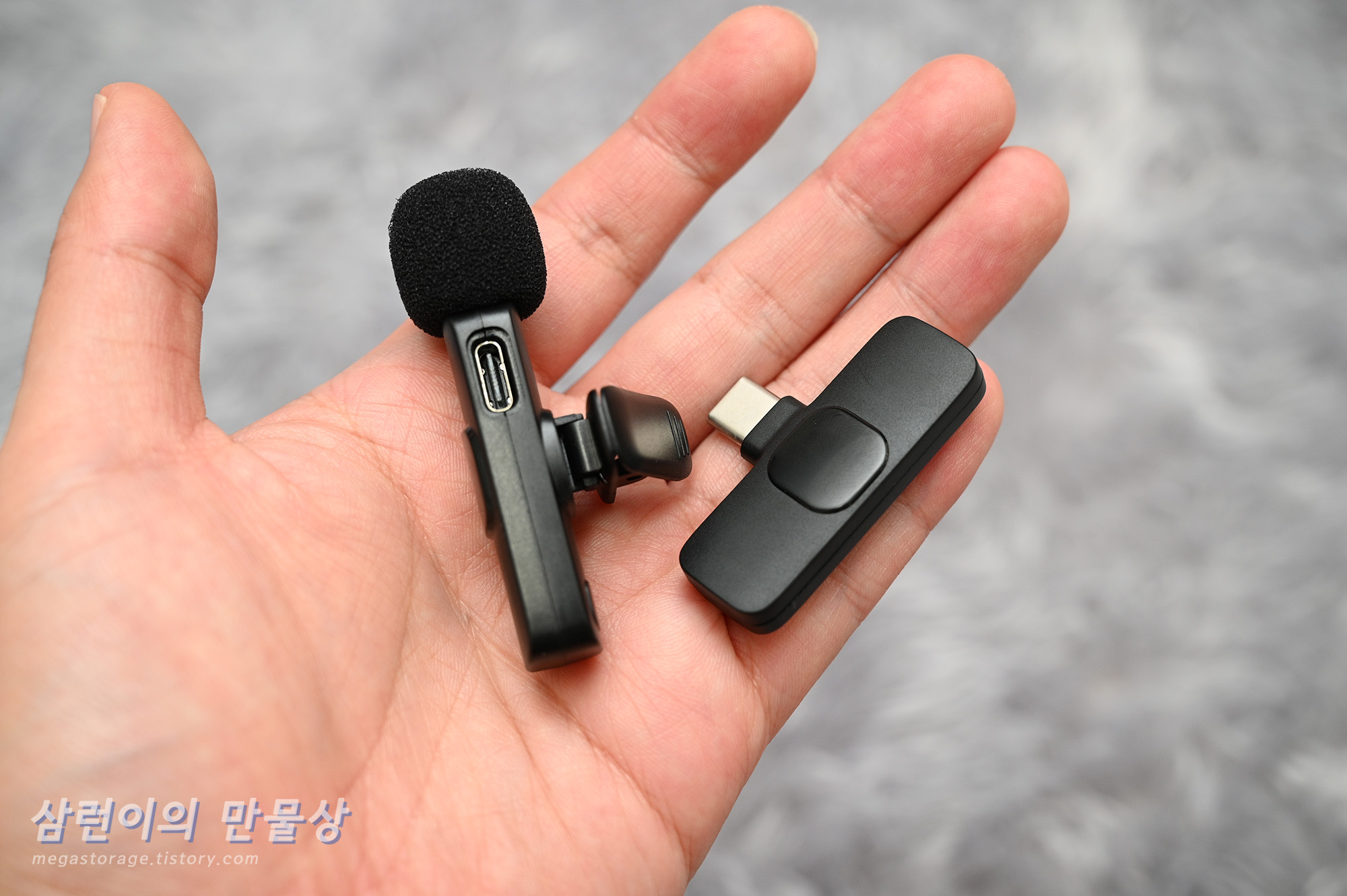 알리 천원마트에서 구입한 초 저가형 USB 무선 마이크입니다. 우측 수신부를 스마트폰에 연결한 후 좌측 마이크의 전원을 켜면 자동으로 연결됩니다.