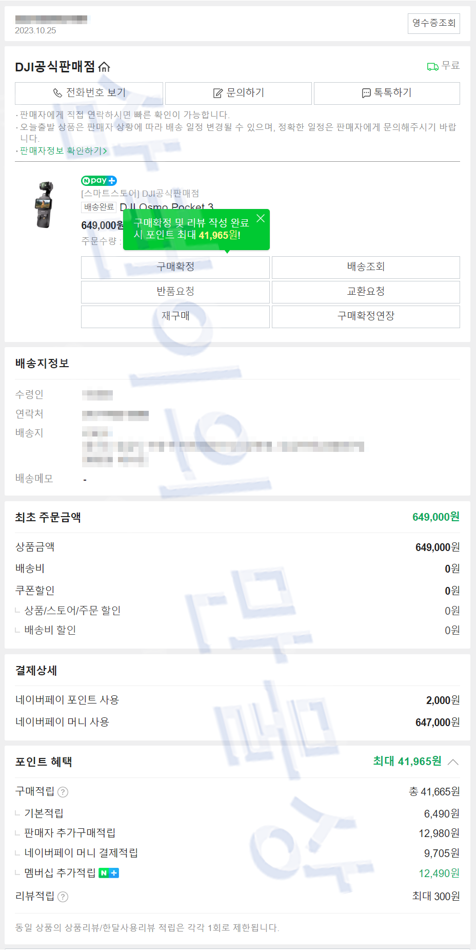 DJI 오즈모 포켓3에는 '일반'과 '콤보'가 있습니다. 제가 구입한 모델은 '일반' 입니다. 64만 9천원에 구입했으며, 최대 적립 포인트 41,965원을 반영하면 체감 구매가는 60만 7,035원 입니다.