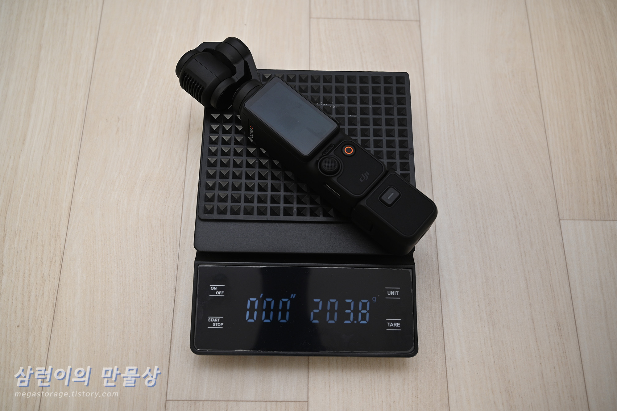 만약 DJI 오즈모 포켓3의 하단에 핸들을 장착하면? 203.8g이 됩니다. 대형 스마트폰 무게랑 비슷해집니다.