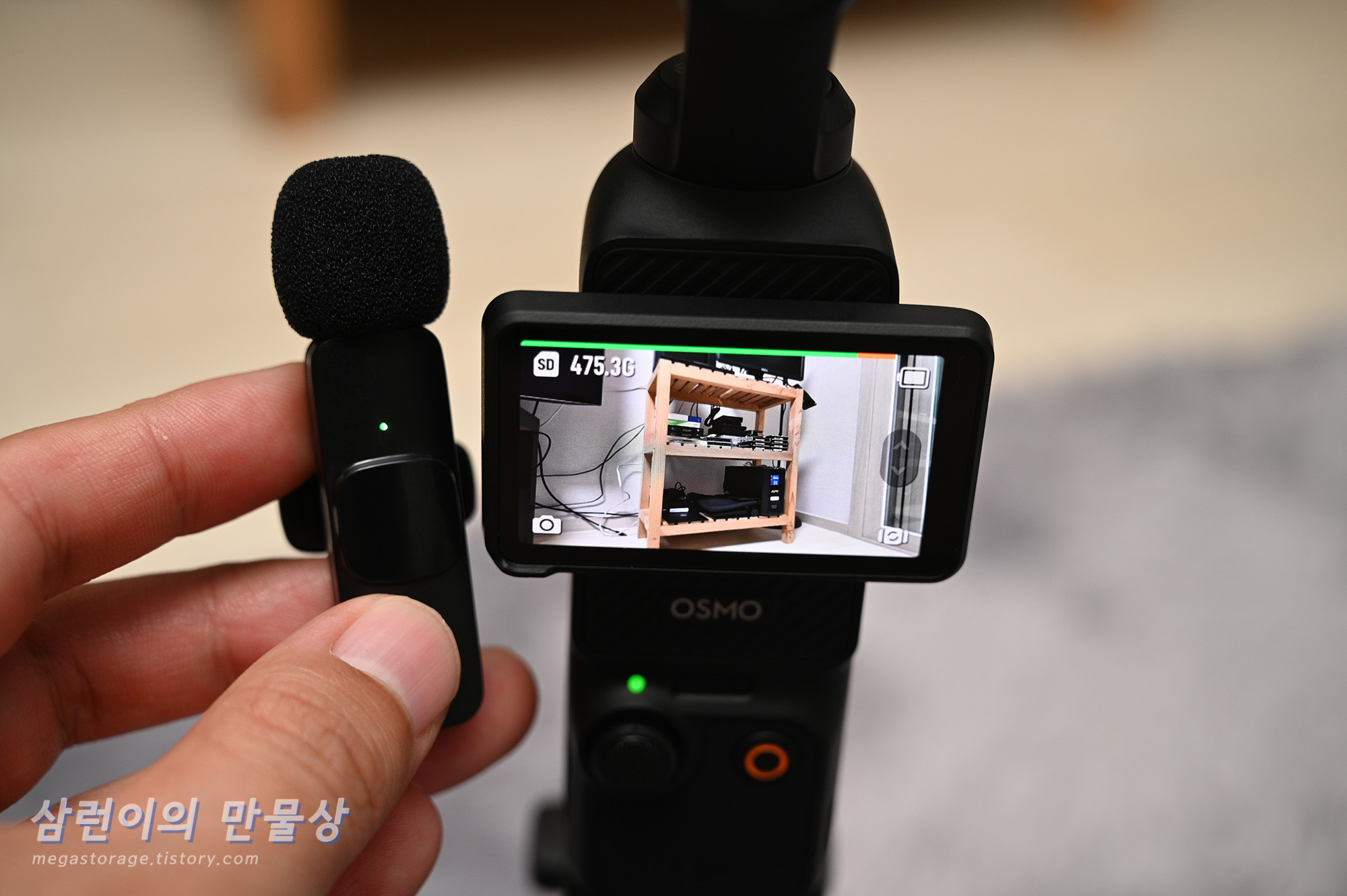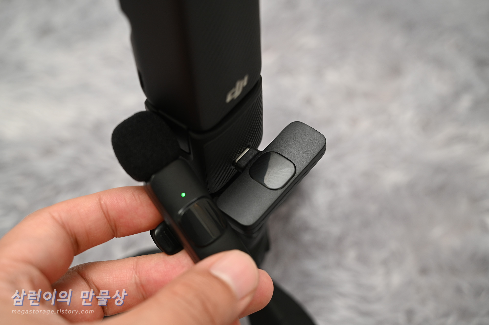 DJI 오즈모 포켓3 핸들의 후면 USB 포트에 수신기를 부착한 후 마이크의 전원을 켜서 연결이 완료된 것을 확인했습니다.