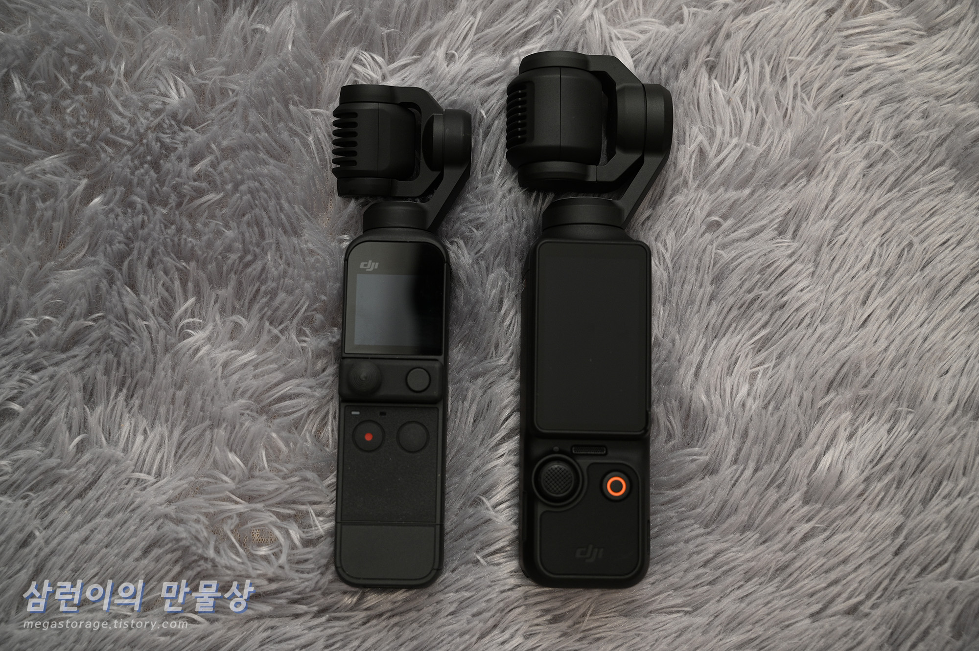 좌측이 DJI 포켓2, 우측은 DJI 오즈모 포켓3 입니다. 위아래 길이가 길어졌으며 좌우 폭도 같이 길어졌습니다.