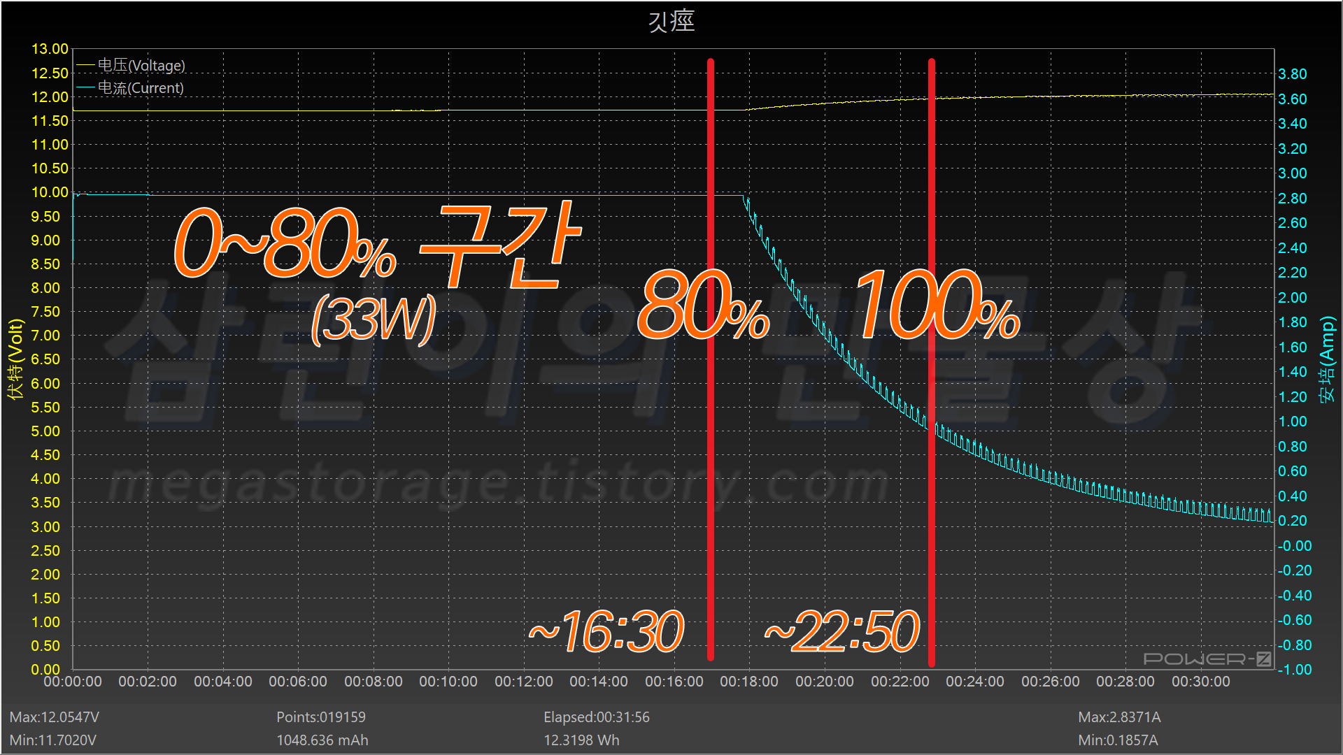 - 0% ~ 80% : 16분 30초 소요 (33W로 꾸준히 입력됨)