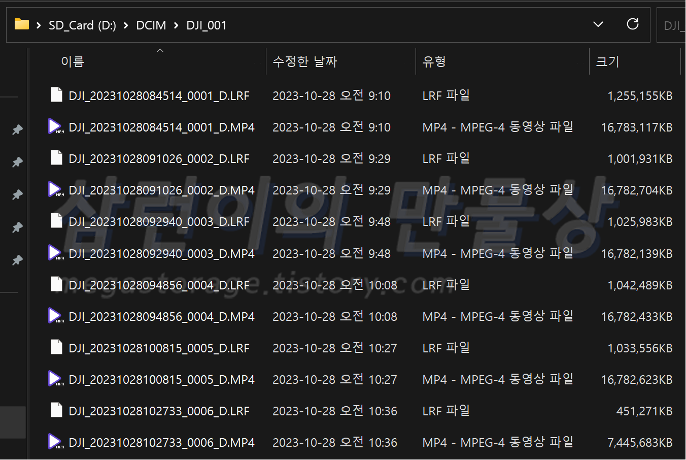 파일명 규칙도 바뀌었습니다. 그런데 이번에도 살짝 난해합니다. 파일명 앞쪽에 년월일시분초가 포함되는 것은 좋은데.. 그 뒤의 숫자는 구분하라고 넣어놓은 것이겠죠? 연속으로 촬영되어 생성된 파일인데 저렇게 나오면.. 나중에 섞였을 때 알아보기 힘든건 똑같을 것 같네요..
