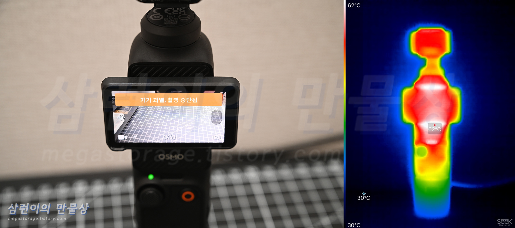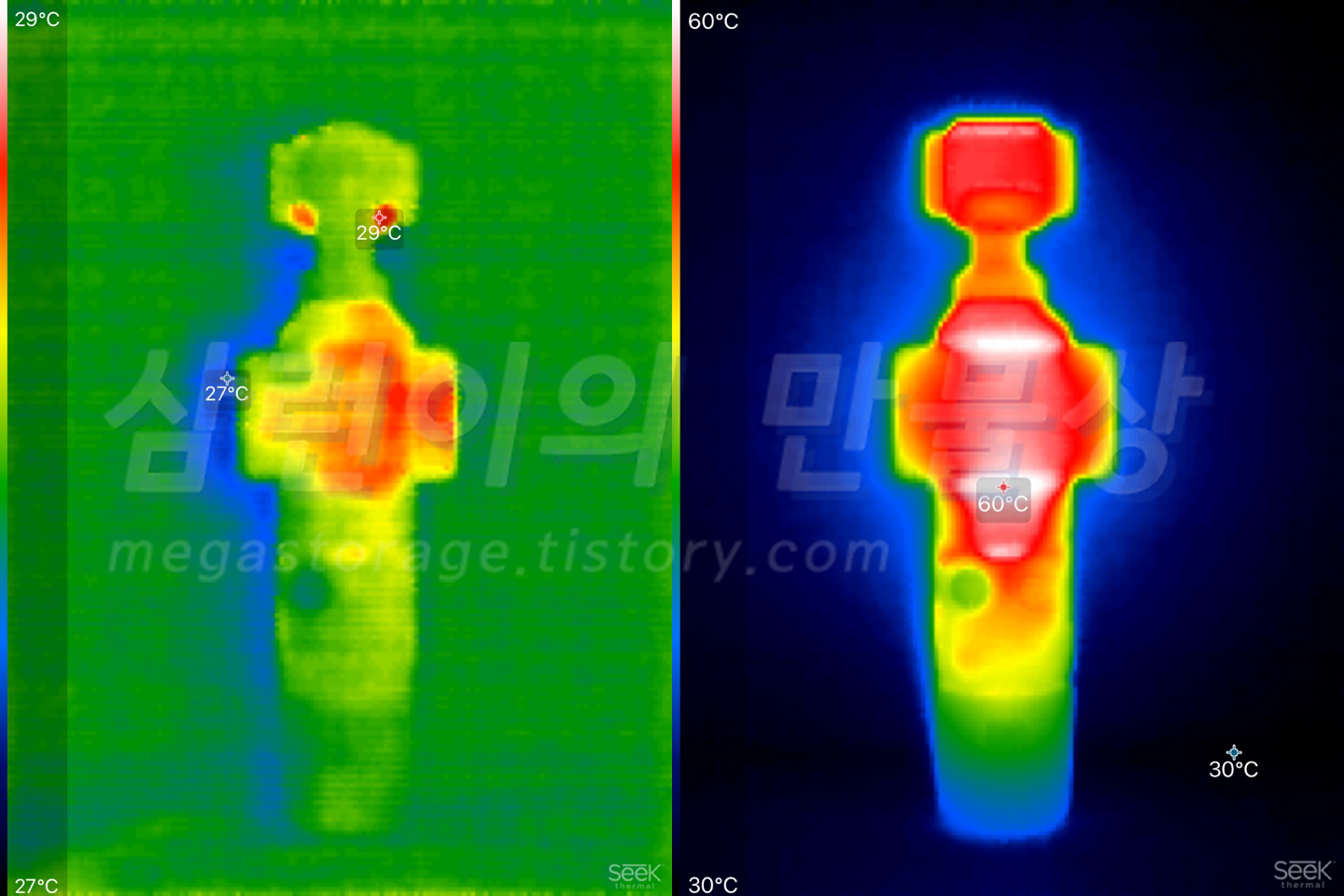 결과를 간단하게 요약하면, DJI 오즈모 포켓3는 최고 60도까지 상승했습니다. 카메라 모듈이 더 뜨거울 것이라 예상했으나 디스플레이가 있는 본체 부분이 제일 뜨거웠습니다.