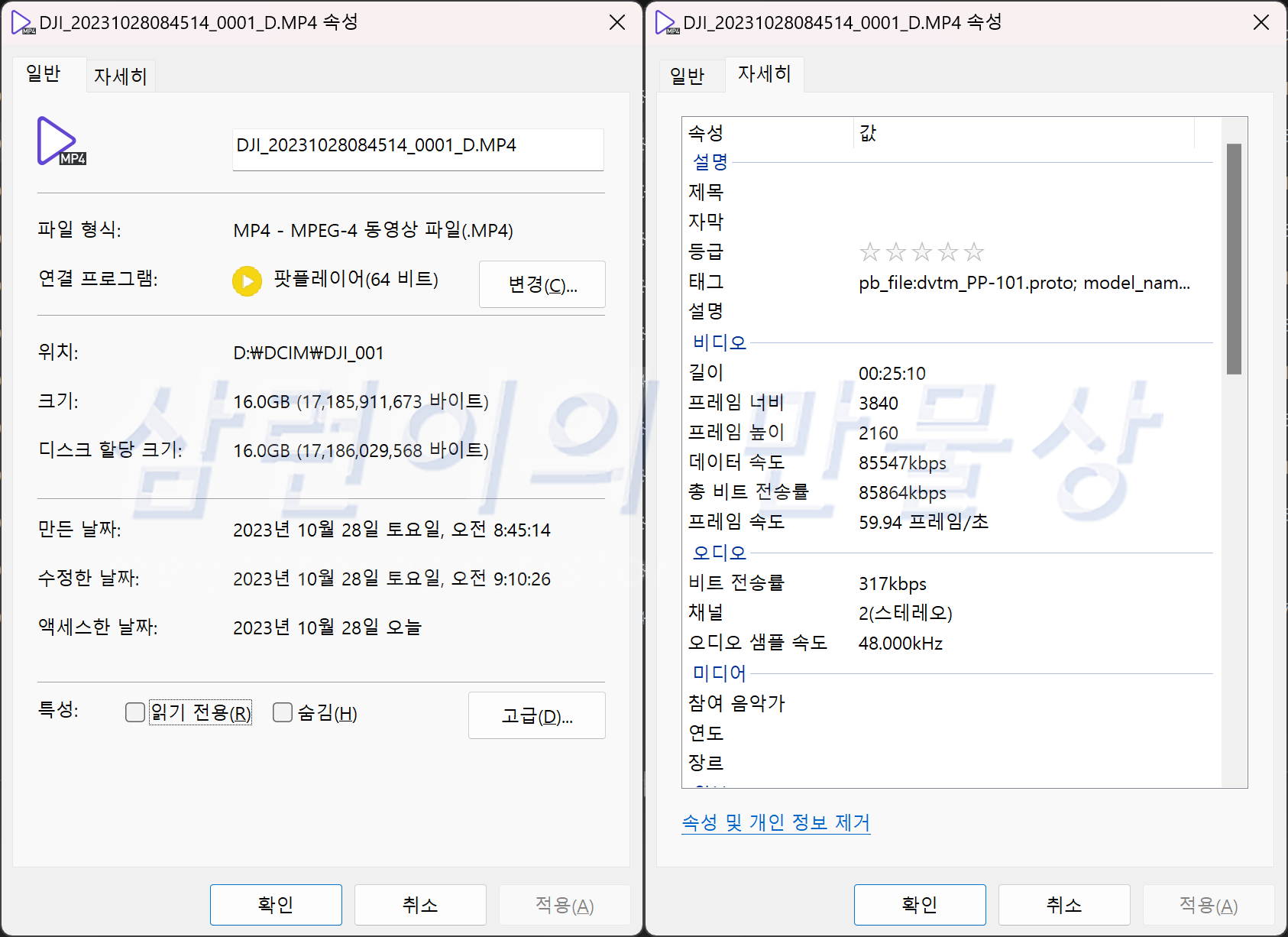 기존 파일당 최대 4GB 용량을 가졌던 DJI 포켓2 대비, DJI 오즈모 포켓3는 영상 파일 하나당 최대 16GB 입니다. 4K 60프레임 설정으로 배터리가 소진될 때까지 촬영했으며, 생성된 영상 파일의 총 용량은 87.1GB(93,551,306,060 바이트) 입니다.