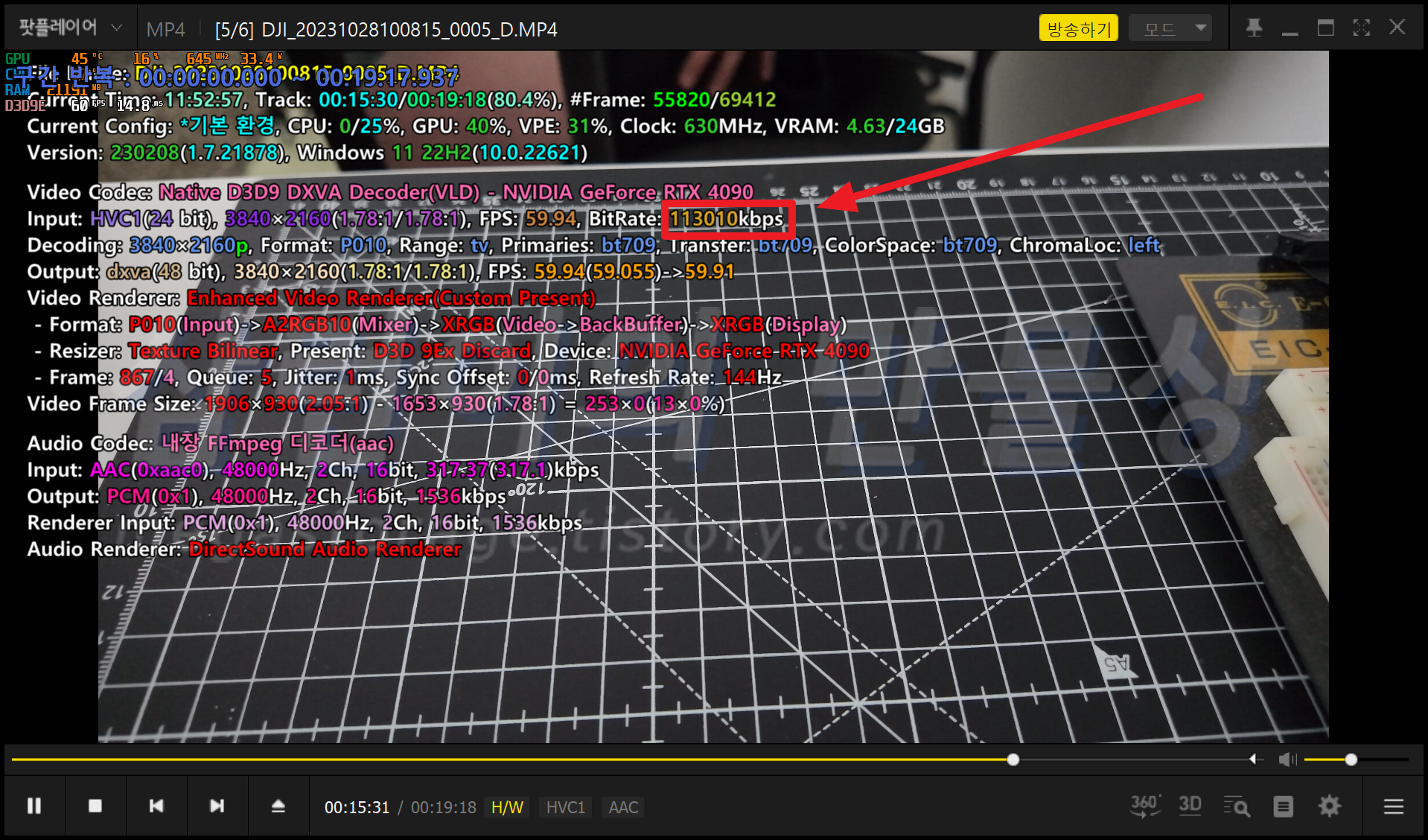 기기의 온도가 가장 높은 60도인 상태이며, 영상의 비트레이트는 113Mbps를 꾸준히 유지하고 있었습니다.