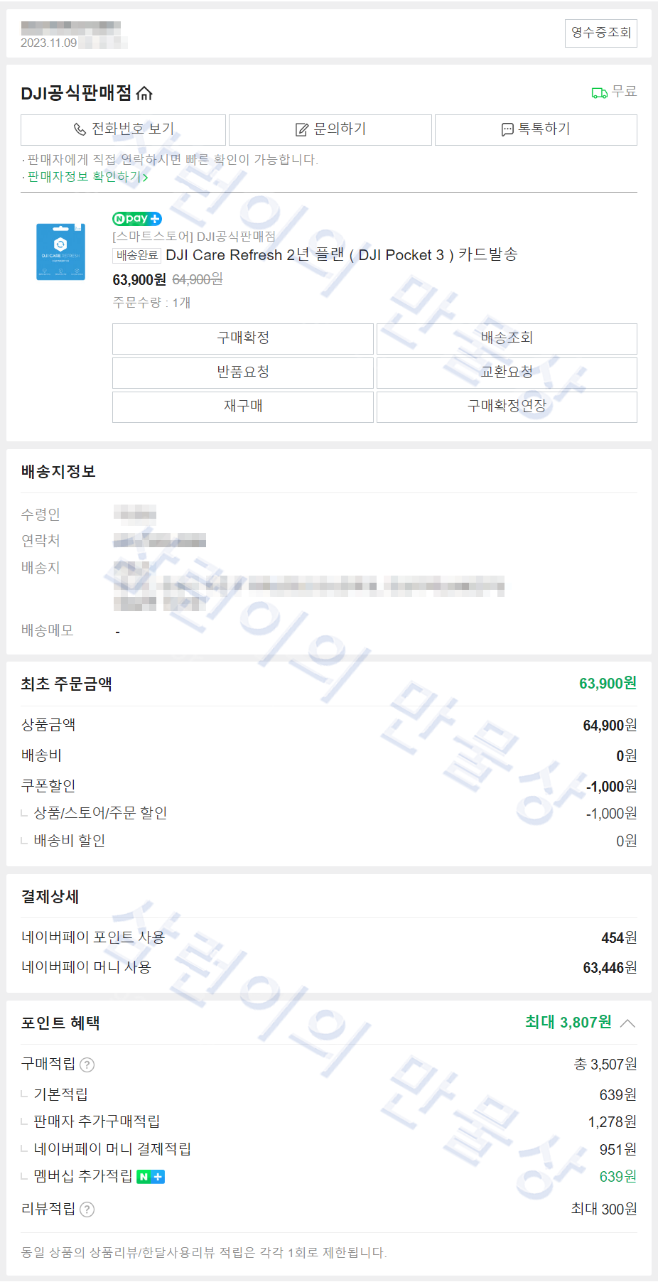 아무 생각 없이 DJI 공식 홈페이지에서 구매를 진행하려고 했습니다. 근데 국내 쇼핑몰에서도 판매하고 있었습니다. DJI 공홈에서 구매하면 1% DJI 크레딧이 적립됩니다. 2년짜리 기준 649점이 적립되겠죠. 국내 네이버 스마트스토어에서 구매하면 기본 1,000원 할인에다가 최대 3,800원이 적립됩니다. 그리고 무료배송입니다. 이러면 DJI 공홈에서 구매를 할 필요가 없겠죠? 그래서 국내에서 구매하기로 결정합니다.