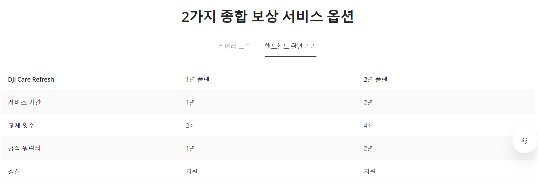 공식 홈페이지의 '서비스 구매'( https://store.dji.com/kr/list/service?category=101%3D101.209.305&site=brandsite&tab=107&sort=recommendation&page=1 ) 에서 구매할 수 있으며, 1년과 2년 플랜은 각각 40,900원/64,900원 입니다. DJI Care Refresh 플랜의 주의 사항은 아래와 같습니다.
