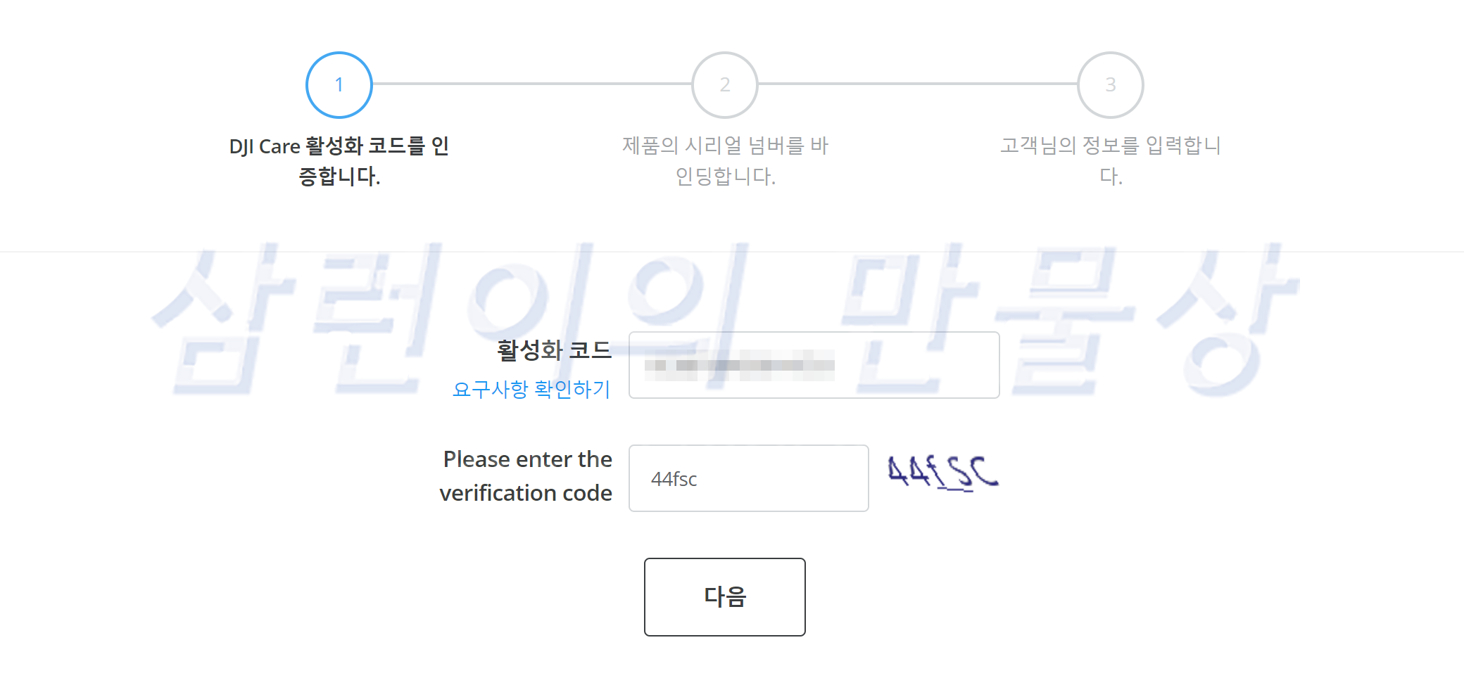 구매한 DJI Care Refresh 코드를 '활성화 코드'에 입력합니다. 코드의 길이가 꽤 깁니다. 오타가 없는지 잘 확인합니다.