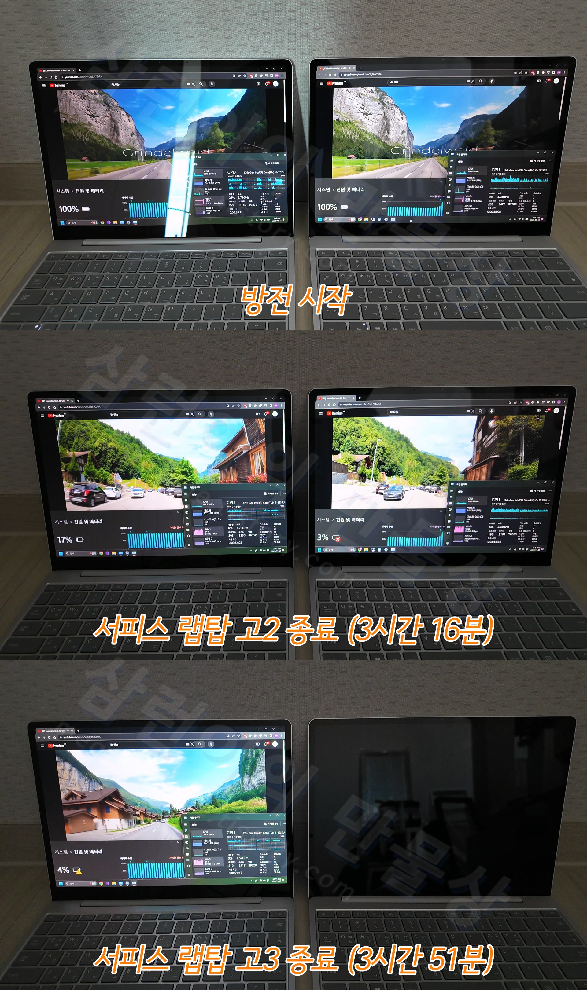 서피스 랩탑 고2는 3시간 16분만에 꺼졌으며 서피스 랩탑 고3는 3시간 51분만에 꺼졌습니다. 두 기기의 차이점은, 랩탑 고2의 GPU 사용률이 40%대였으며 랩탑 고3의 GPU 사용률은 20%대였습니다.