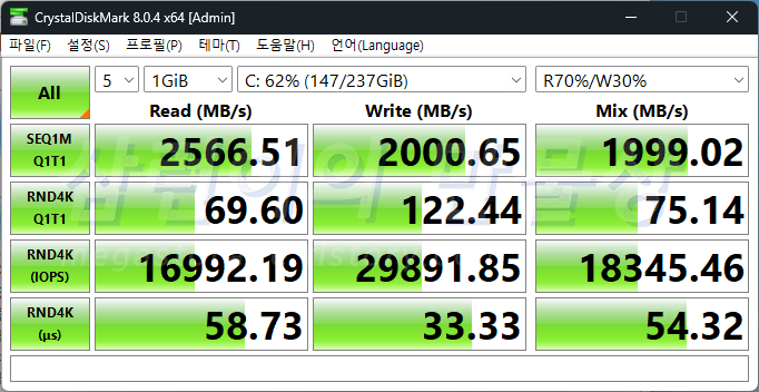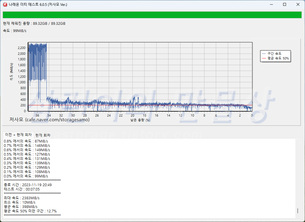 SSD의 용량 절반 이상 차 있는 상태에서 Crystal Disk Mark의 '실제 성능 모드'로 측정했습니다. 일반적인 PCIe 4.0 NVME SSD의 속도입니다. 2GB/s 넘는 속도는 대부분 캐시의 영향이 크므로, 정확한 성능 확인을 위해서 '나레온 더티 테스트' 프로그램을 돌렸습니다.