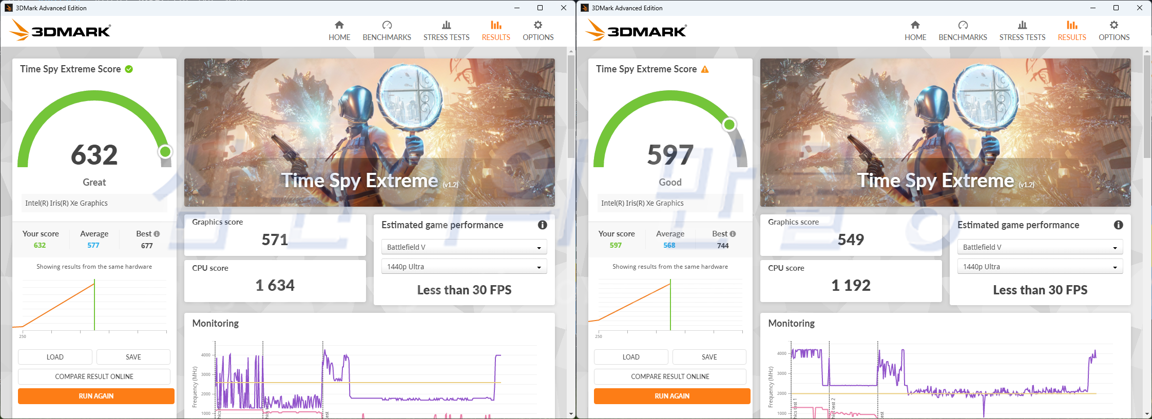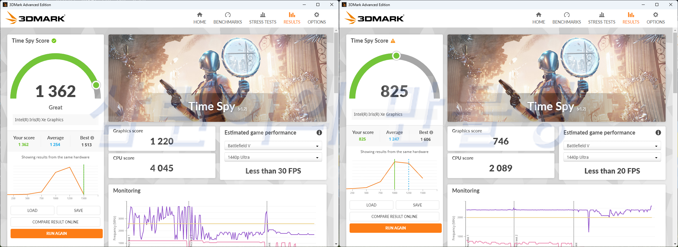 3DMark에서 타스(Time Spy) 벤치마크 결과입니다. 좌측이 서피스 랩탑 고3, 우측이 서피스 랩탑 고2 입니다. 그래픽 점수 기준으로 서피스 랩탑 고3가 63% 더 빠릅니다. CPU 스코어는 거의 2배 수준입니다.