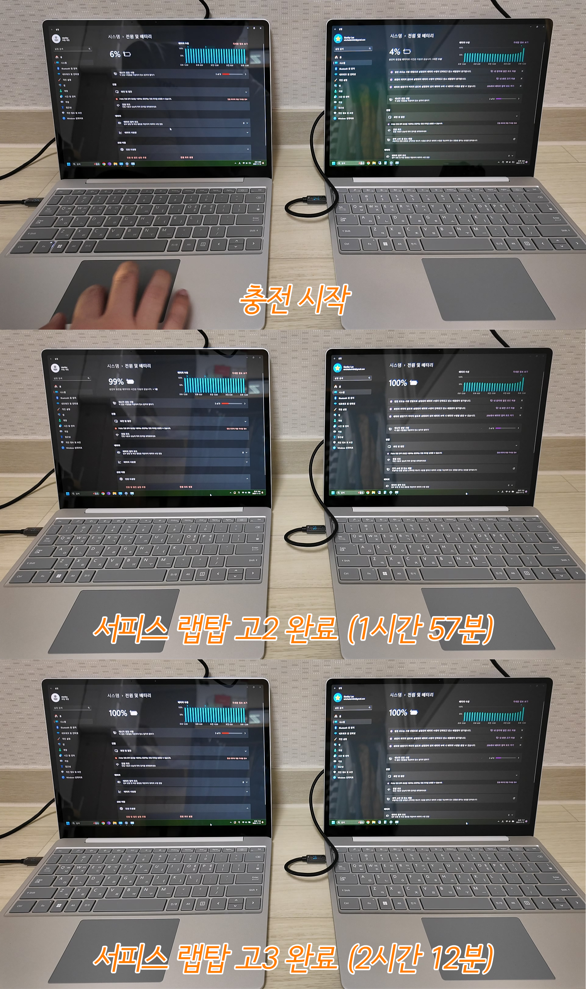 서피스 랩탑 고2는 완전 충전까지 1시간 57분 소요되었고, 서피스 랩탑 고3는 완전 충전까지 2시간 12분 소요되었습니다. 서피스 랩탑 고3가 악조건(방전 완료 후 얼마 지나지 않음)이었던 것을 고려하면, 충전 속도는 비슷한 것으로 보입니다.