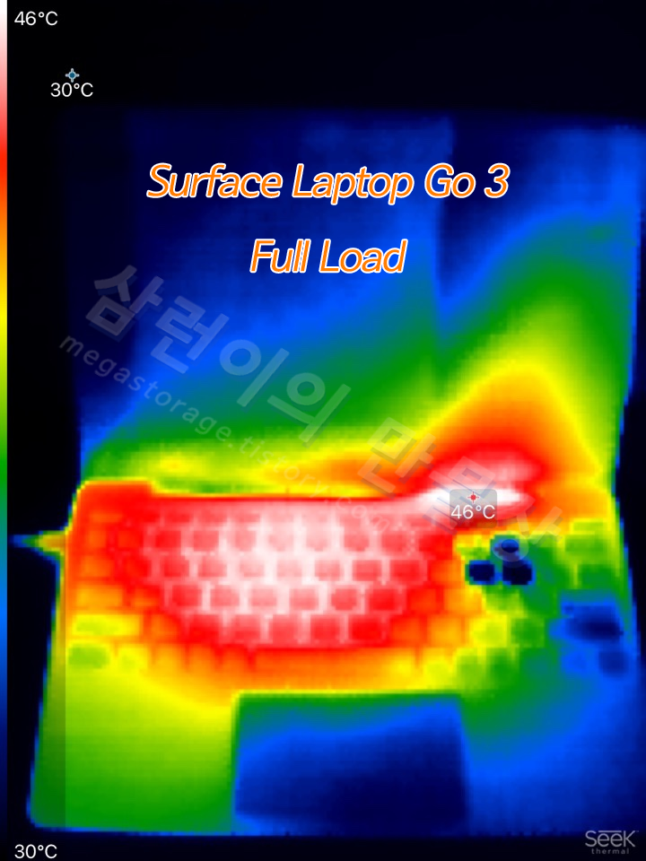 기기의 온도 측정을 위해 Seek Thermal의 Seek Thermal Compact를 사용했습니다. 서피스 랩탑 고3가 풀로드 상태일 때의 모습입니다. 공기 흡입구는 키보드 상단 좌측이며, 배출구는 키보드 상단 우측입니다. 키보드 상단 부분이 제일 뜨겁습니다.