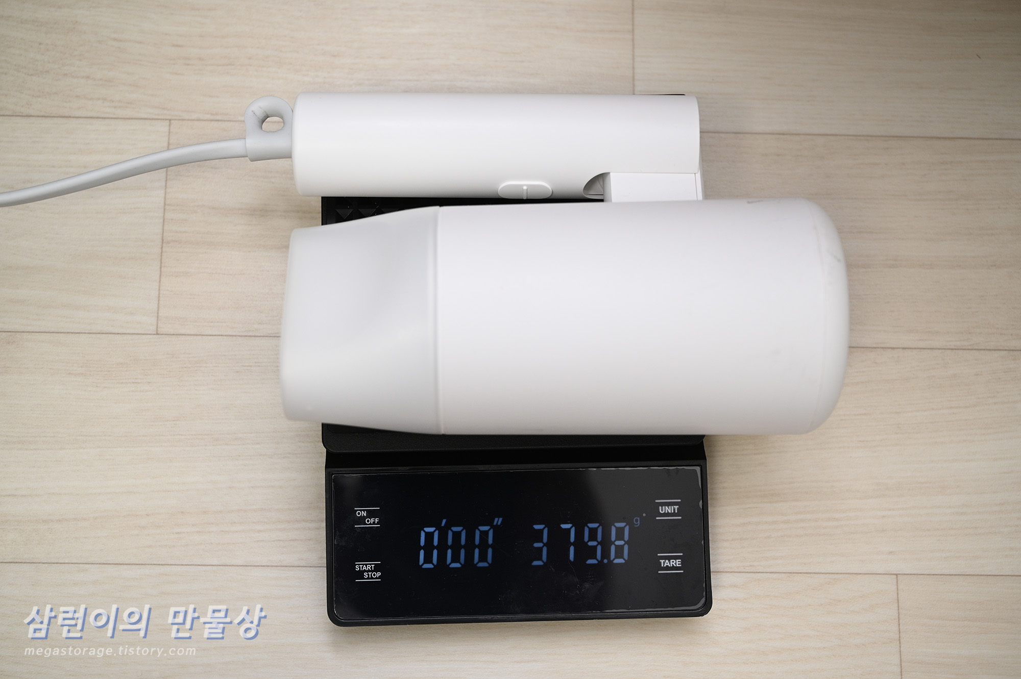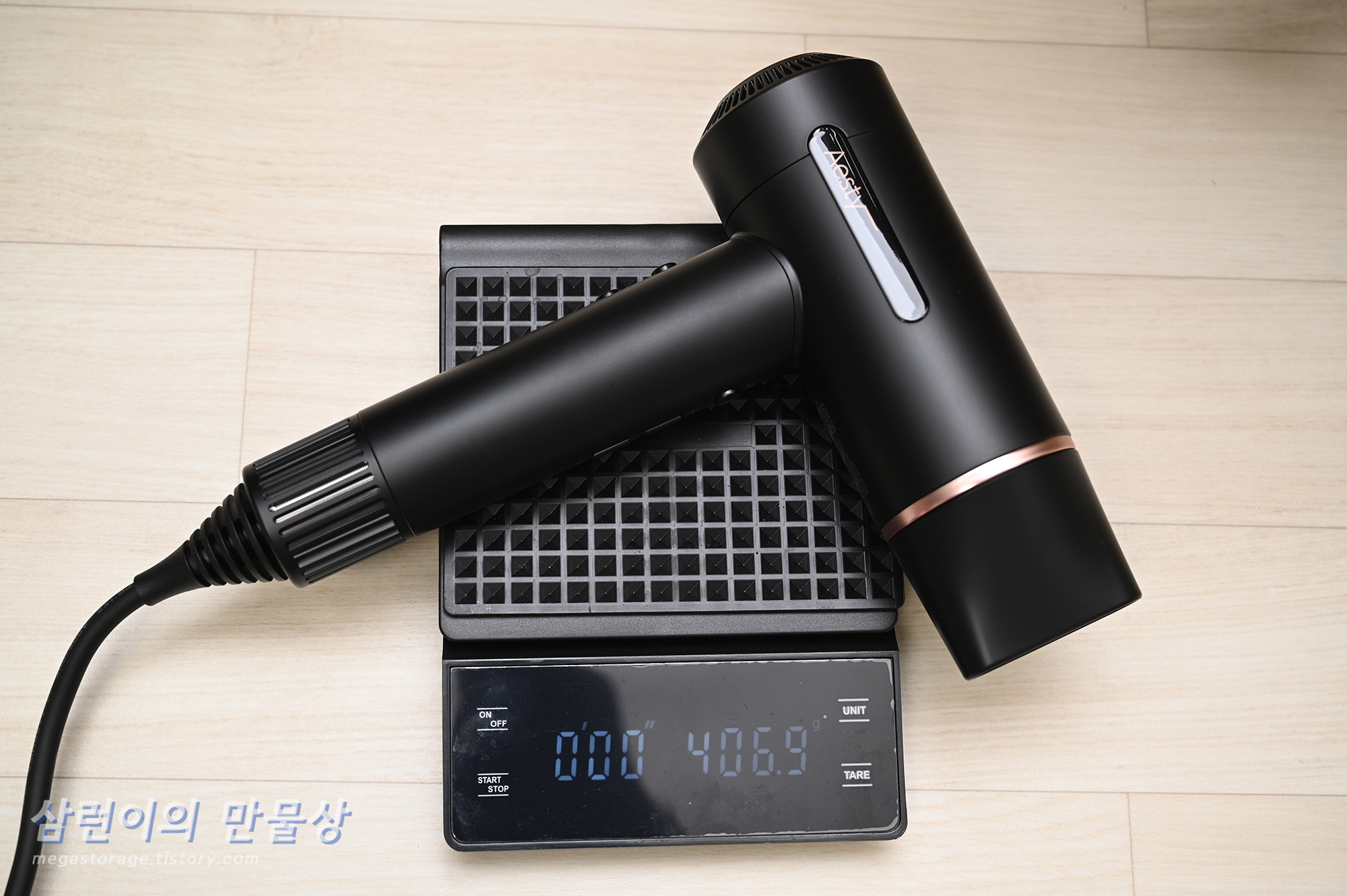 에스티 에어부스터 헤어 드라이어의 무게는 407g으로 측정되었습니다. (전선 무게 제외)