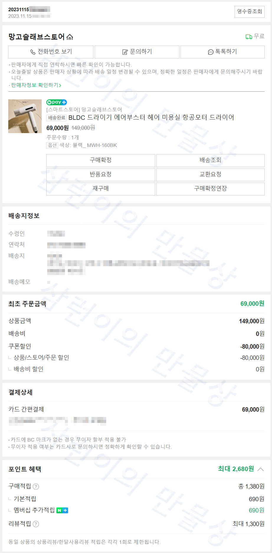 2023년 11월 15일에 네이버 망고슬래브 스토어에서 구매했으며 69,000원 지불했습니다. 배송비는 무료이며 카드로 결제한거라서 최종 적립되는 포인트는 2,680원입니다.