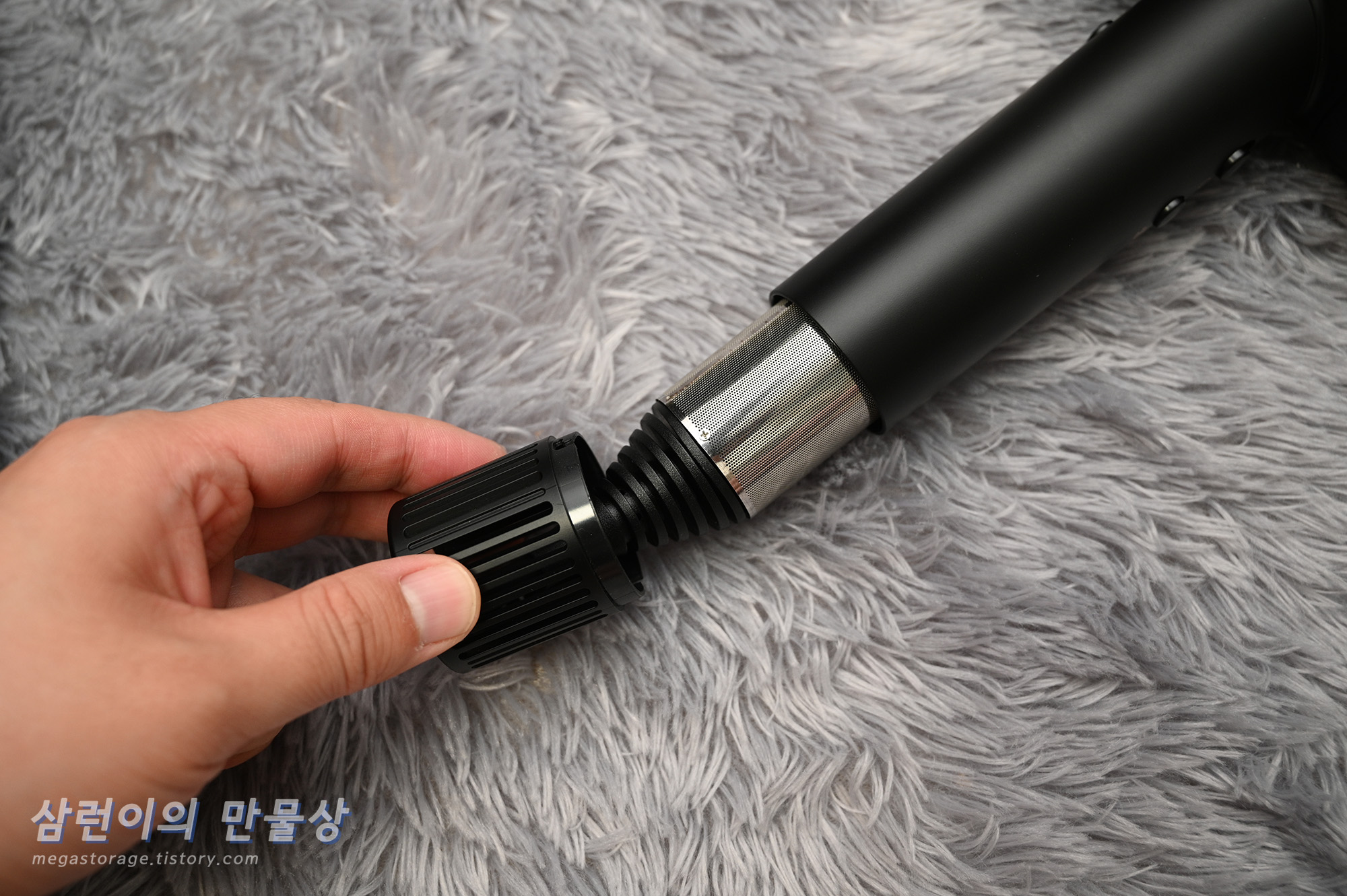 에스티 에어부스터 헤어 드라이기의 바람 출구에 깔대기를 장착하면 위의 모습과 같습니다. 깔대기는 자석으로 붙으며 강하게 붙어있습니다.