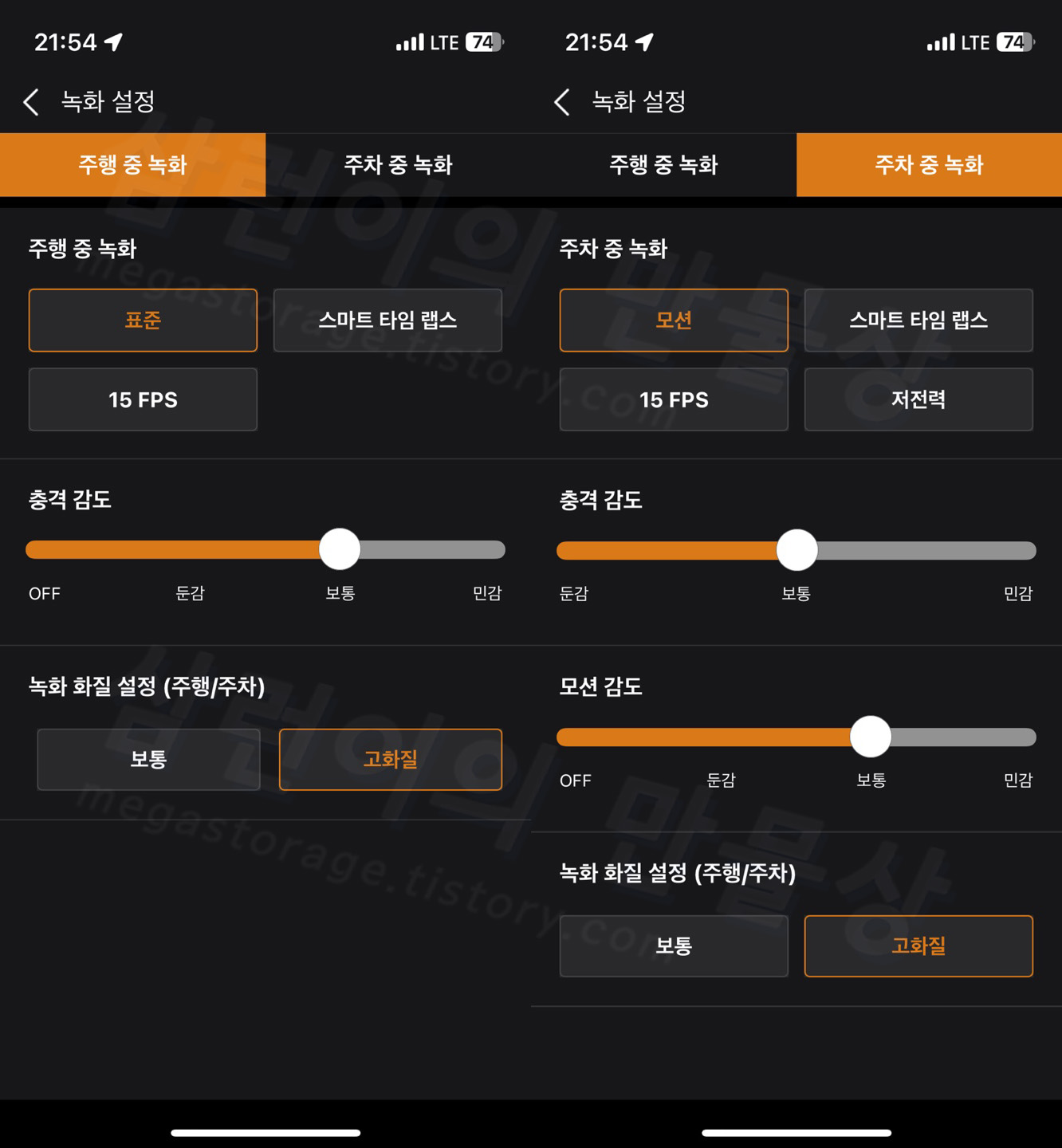 '주차 중 녹화' 메뉴에서는 모션/스마트 타임랩스/15FPS/저전력이 있습니다. 모션은 일반 녹화, 스마트 타임랩스와 15FPS는 위 내용과 같습니다. '저전력' 모드 선택 시 최대 96일간 촬영이 가능하다고 합니다. 슬립 들어가있다가 충격이 감지되면 깨어난 후 녹화하는 것 같은데... 이벤트 발생 직후부터 녹화가 될 것이라서 큰 의미가 있나 싶습니다.