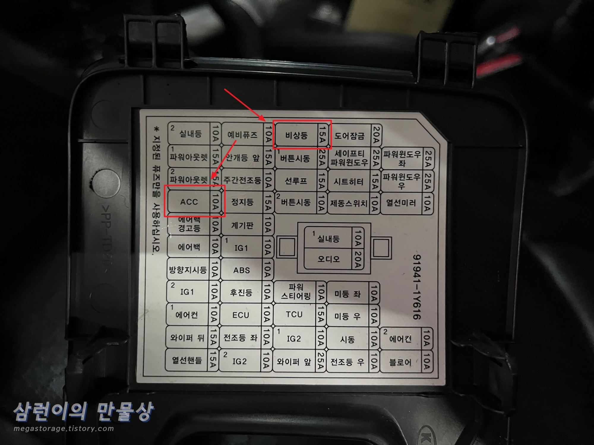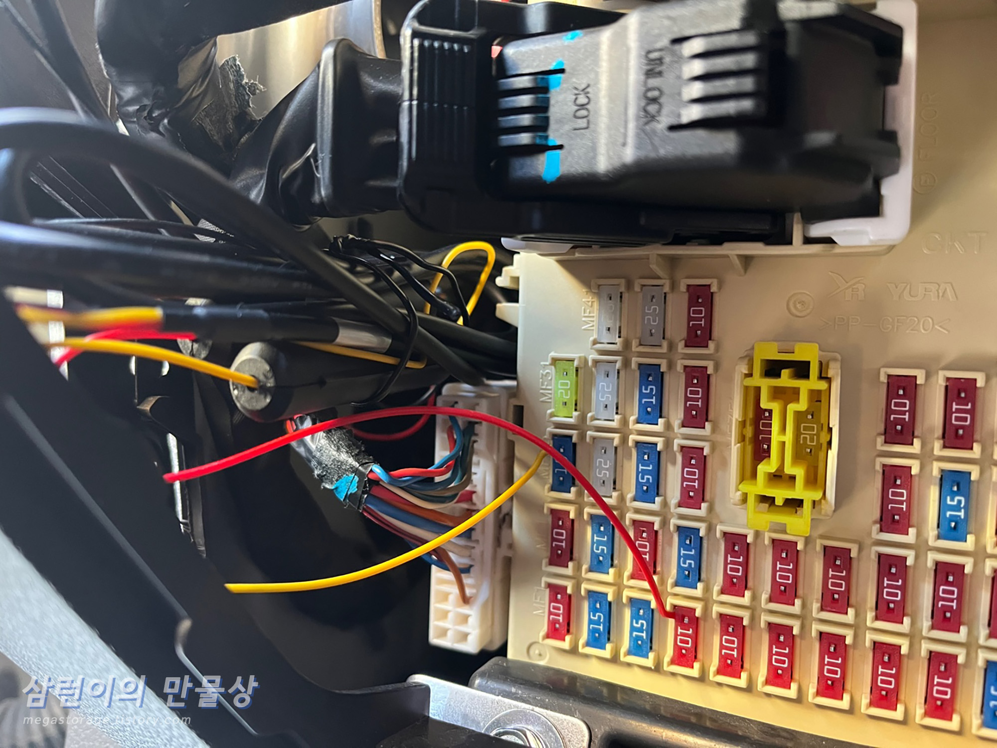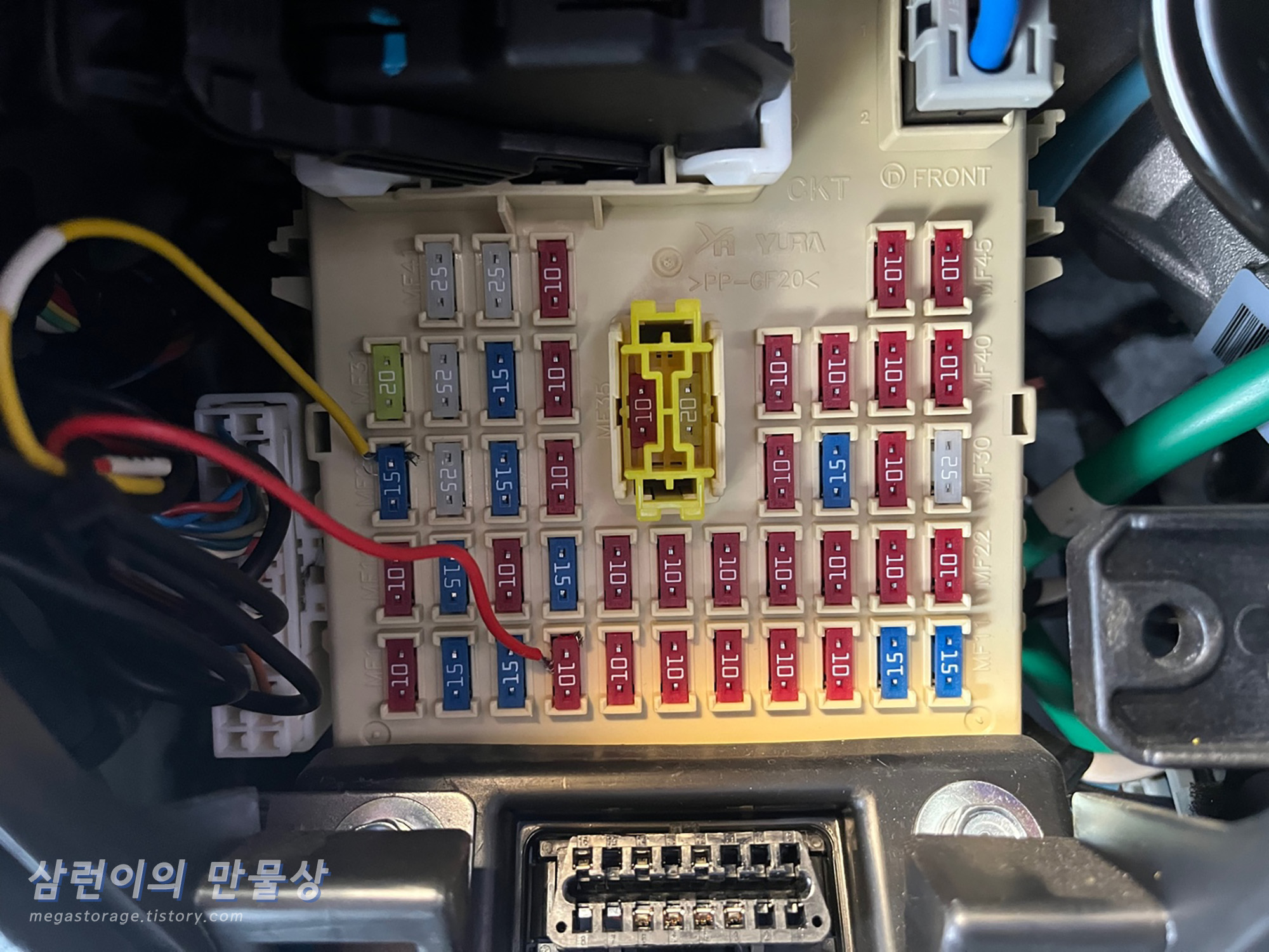 전원 케이블의 길이가 꽤 깁니다. 빵끈 같은 것으로 묶어둔 후 퓨즈박스 측면에 잘 넣었습니다.