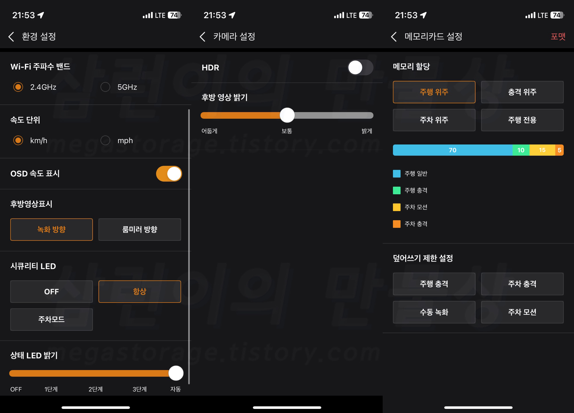 스마트폰 앱으로 Wi-Fi 연결 후 전방 및 후방 카메라의 각도를 조절했습니다. 이렇게 설치가 끝났습니다. 설치가 끝난 당일 주간과 야간에 테스트 주행을 했습니다.