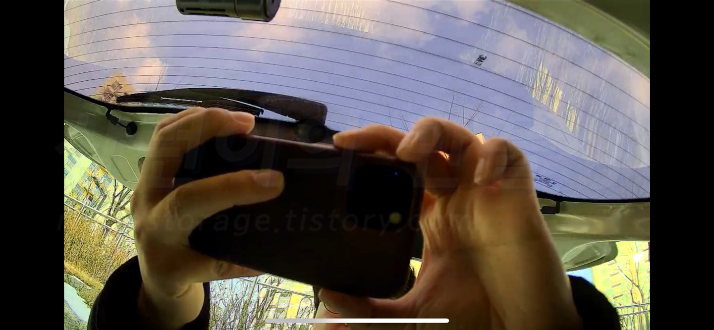 그런데 후방카메라 제거하는게 상당히 난이도 높았습니다. 겉에서 열풍기나 드라이기로 열을 가해준 후 떼어내야 하는데... 그냥 제거하려고 했다가 썬팅지가 조금 찢어졌습니다.