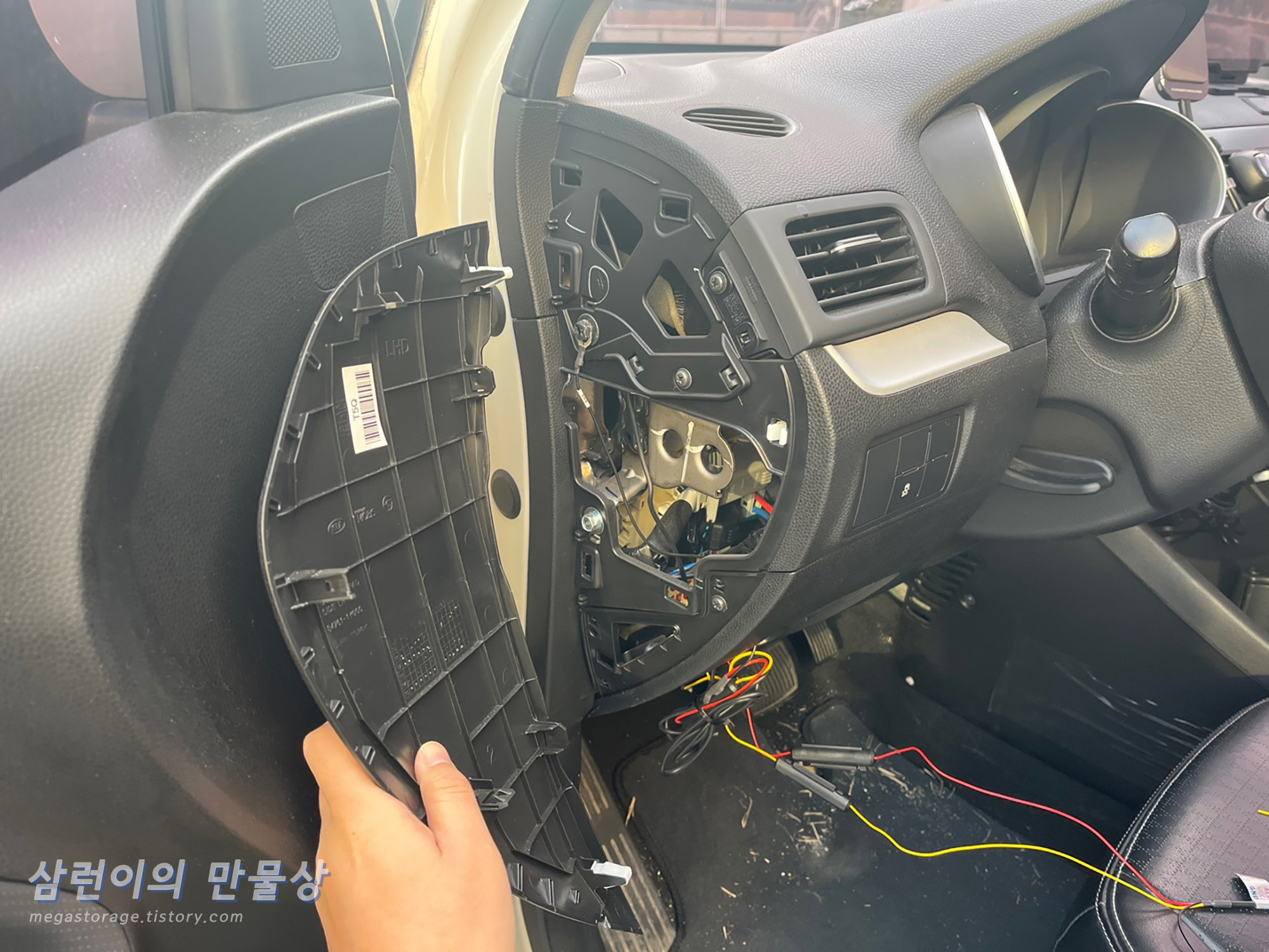 GND 케이블을 제거해줘야 하기 때문에, 퓨즈박스의 좌측 판넬(?)을 제거합니다. 아래쪽의 홈에 일자 드라이버 같은 것을 넣고, 살짝 들어올려 주면서 위쪽으로 점점 이동하면 쉽게 탈거가 됩니다.