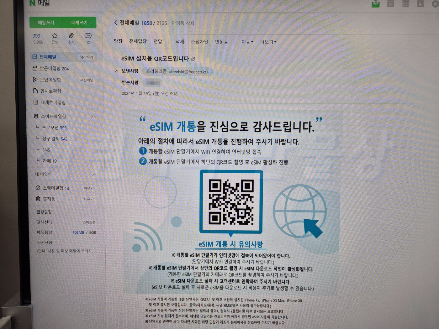 그리고 이심 개통을 위한 QR코드 링크를 전달 받을 메일 주소를 말해주면, 아래의 내용을 메일로 받을 수 있습니다.