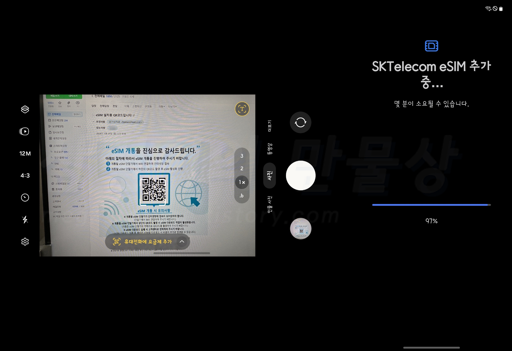 좌측 그림처럼 카메라 앱으로 QR코드를 스캔하면 '휴대전화에 요금제 추가' 메뉴가 뜨고, 누르고 나면 이심 다운로드가 진행됩니다.