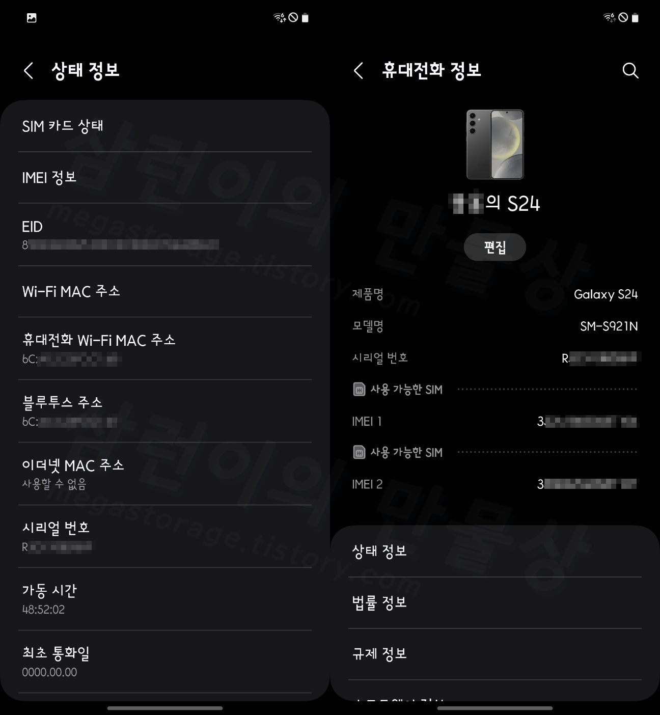 갤럭시 기기 기준으로 '설정'의 '휴대전화 정보'와 '상태 정보'에서 3가지 정보를 확인할 수 있습니다.