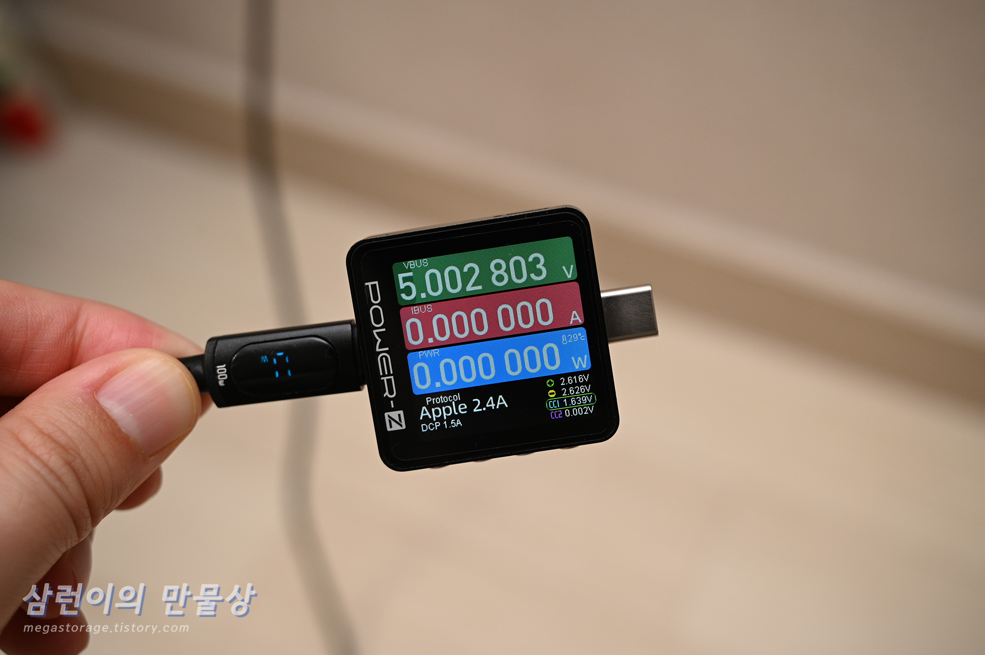 계측기의 전원이 켜진 후 충전기와 연결했습니다. 충전기는 '아트뮤'의 45W PD 충전기인 GA210 입니다. 충전기와 연결만 했을 땐 5V 전압이 나옵니다. 프로토콜은 Apple 2.4A 라고 표시됩니다.