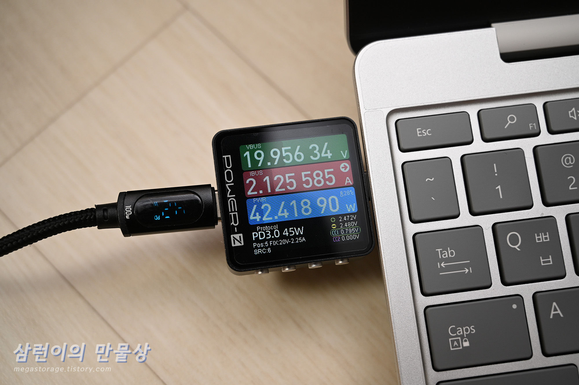 저의 사랑스러운 노트북인 '마이크로 소프트'의 '서피스 랩탑 고3'에 연결했습니다. 해당 노트북의 최대 입력 전력인 42W가 표시되는 것을 알 수 있습니다. 20V @ 2.12A로 입력되고 있습니다.
